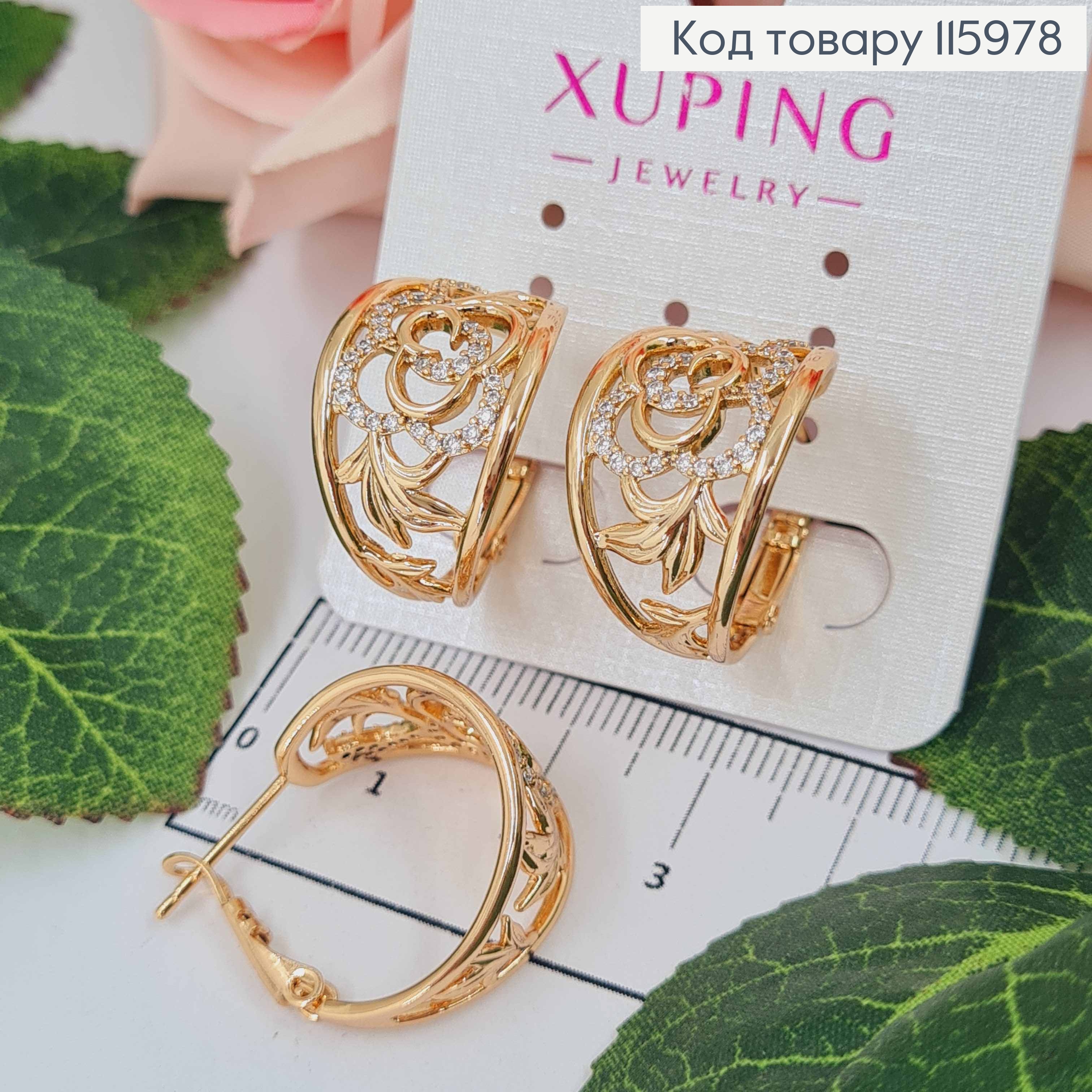 Серьги кольца 2см, ажурные с камешками, шир. 1,5см. Xuping 18K