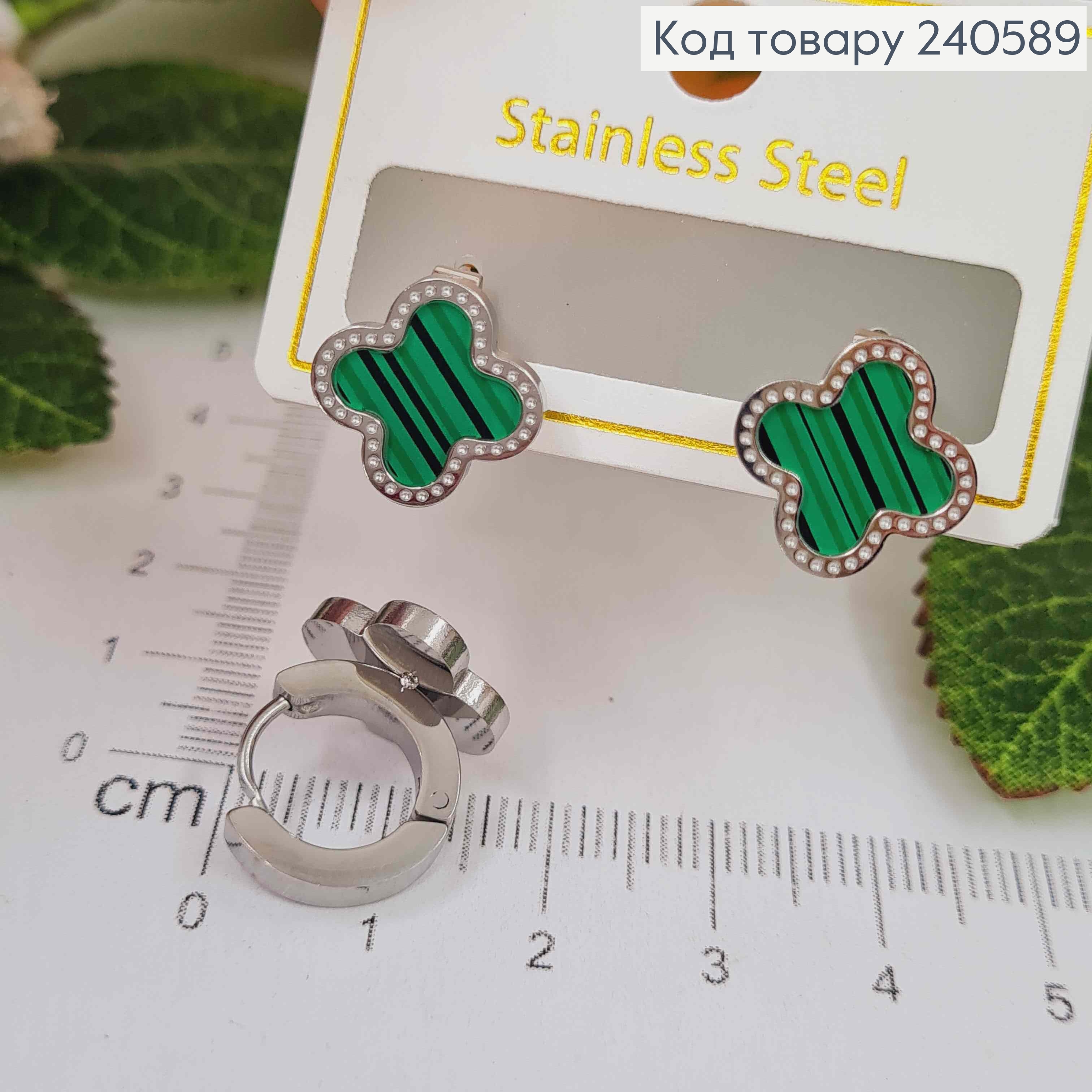 Серьги кольца, серебряного цвета, с зеленой эмалью, "Van Cleef", сталь Stainless Steel