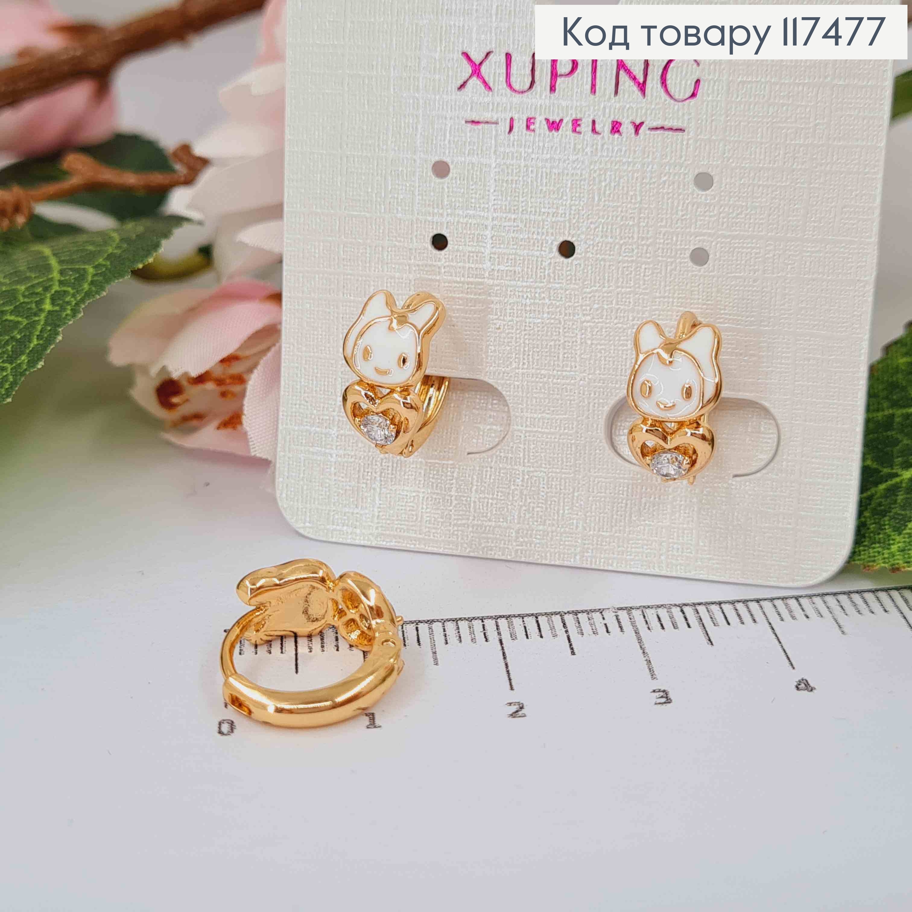 Серьги кольца, "Зайка" с белой эмалью и Камешком в Сердце, диаметр 1,3см, Xuping 18К