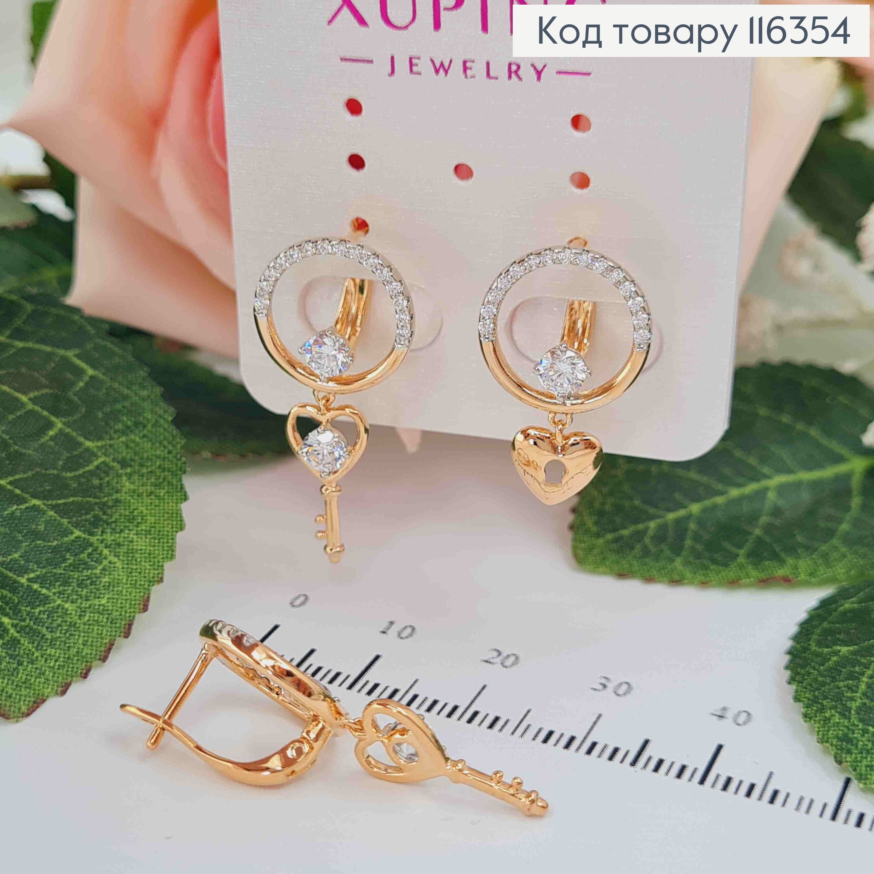 Серьги, Круги с камнем и асимметричными подвесками Ключиком и Замочком, 2см, англ. зам. Xuping 18K