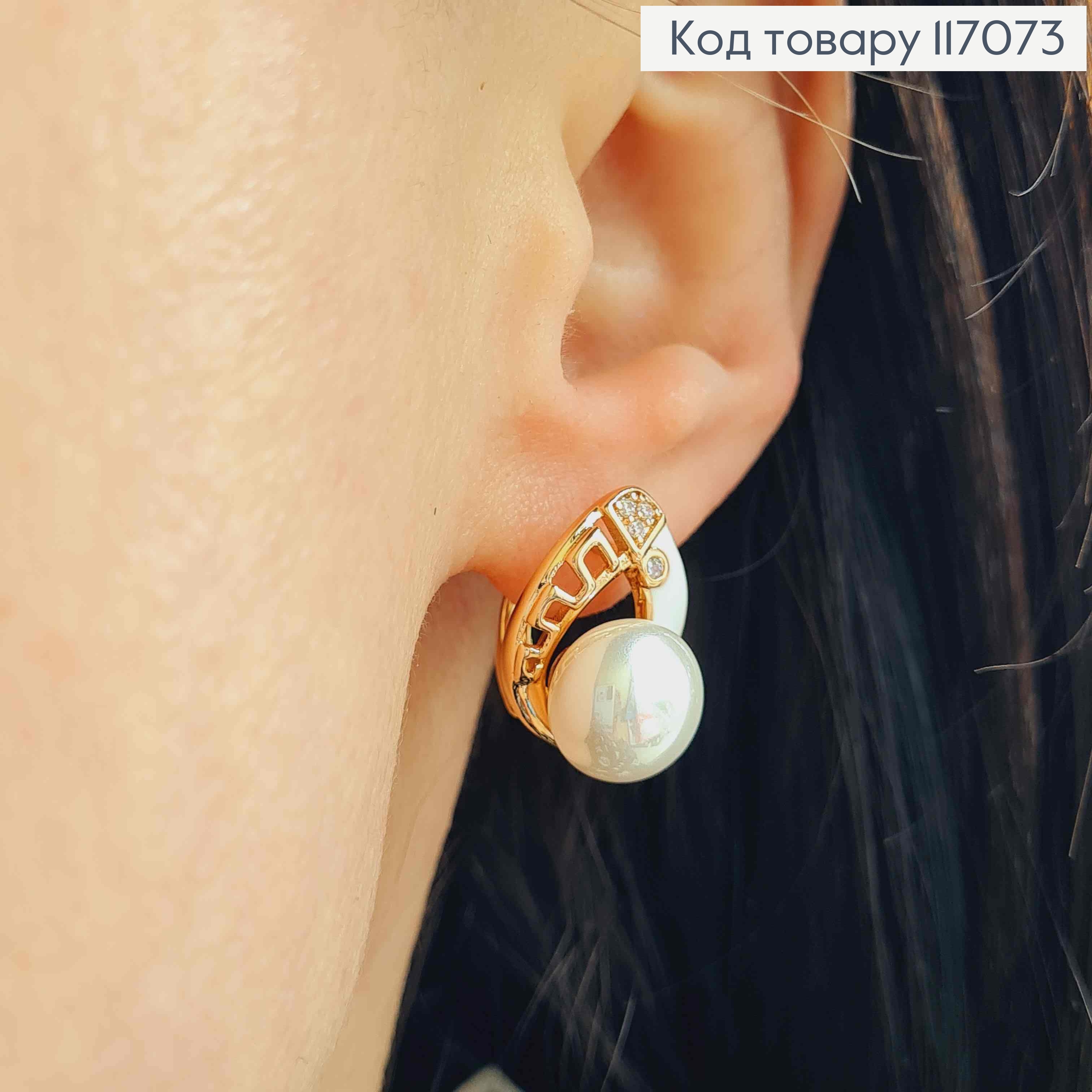Серьги Листочек с бывшей эмалью и жемчужиной, 2см, англ. зам. Xuping 18K