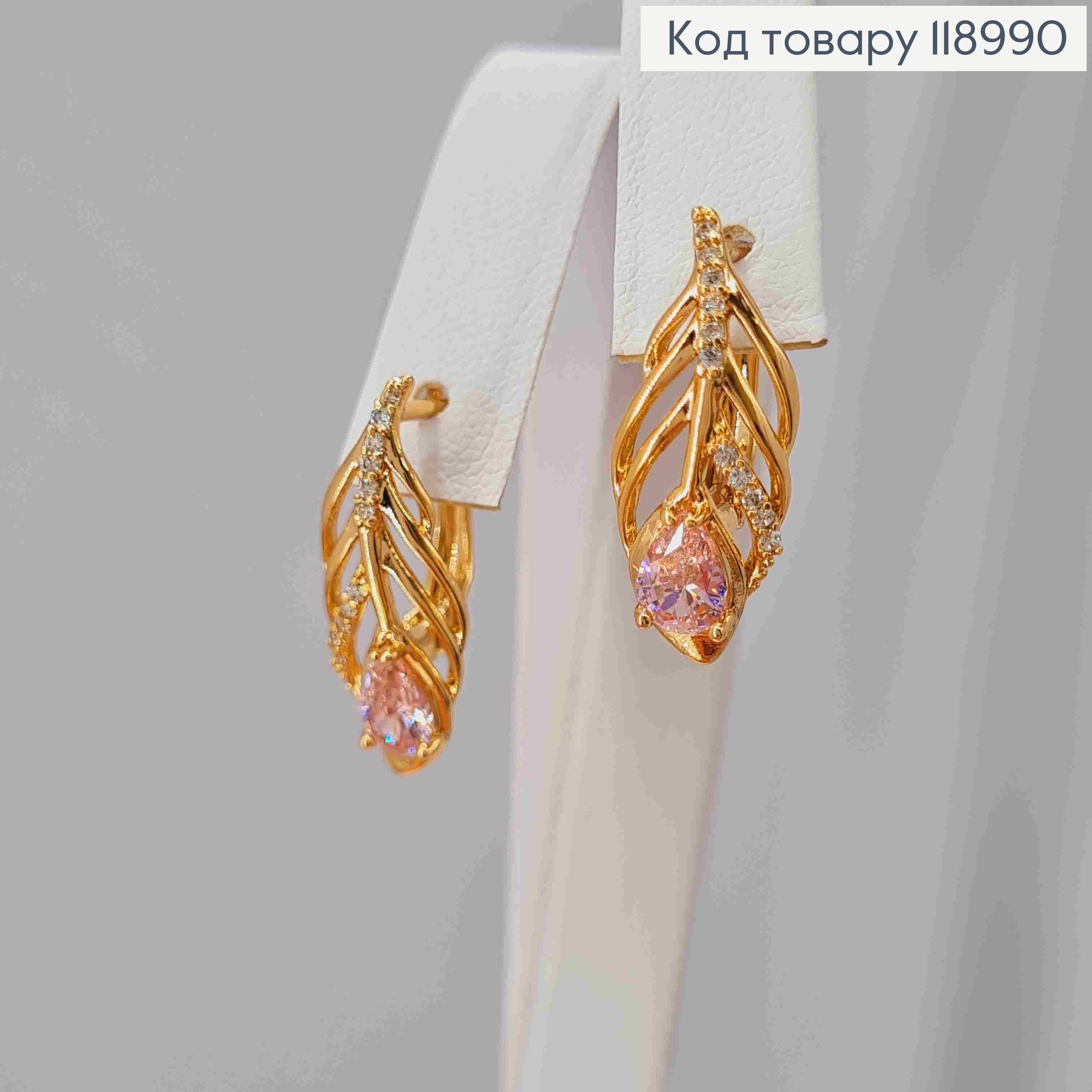 Серьги "Перо Павлина" с Розовым камнем, 2см, англ. застежка, Xuping 18К