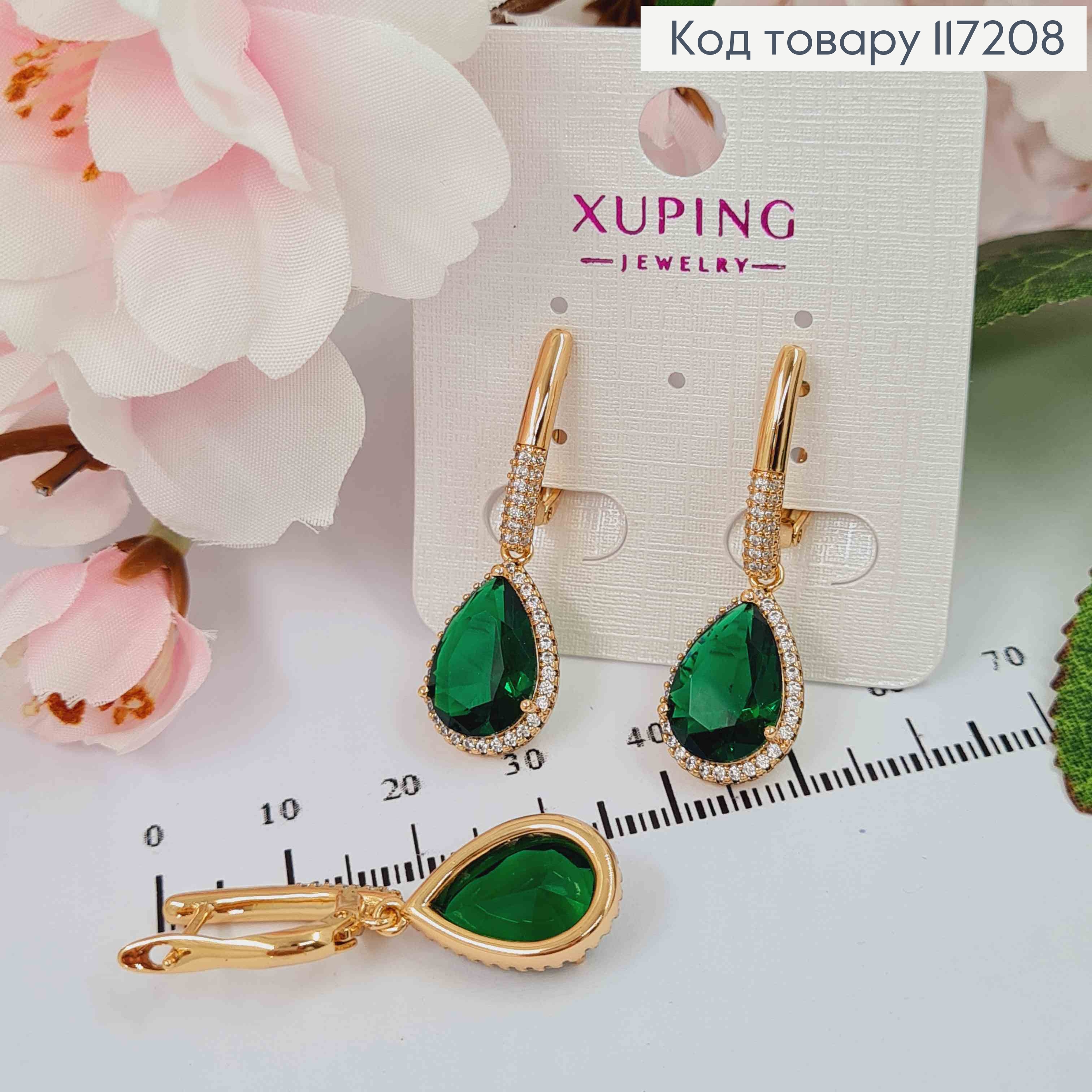 Серьги подвески с большим ЗЕЛЕНЫМ камнем, длина 2+1,5см, XUPING 18K