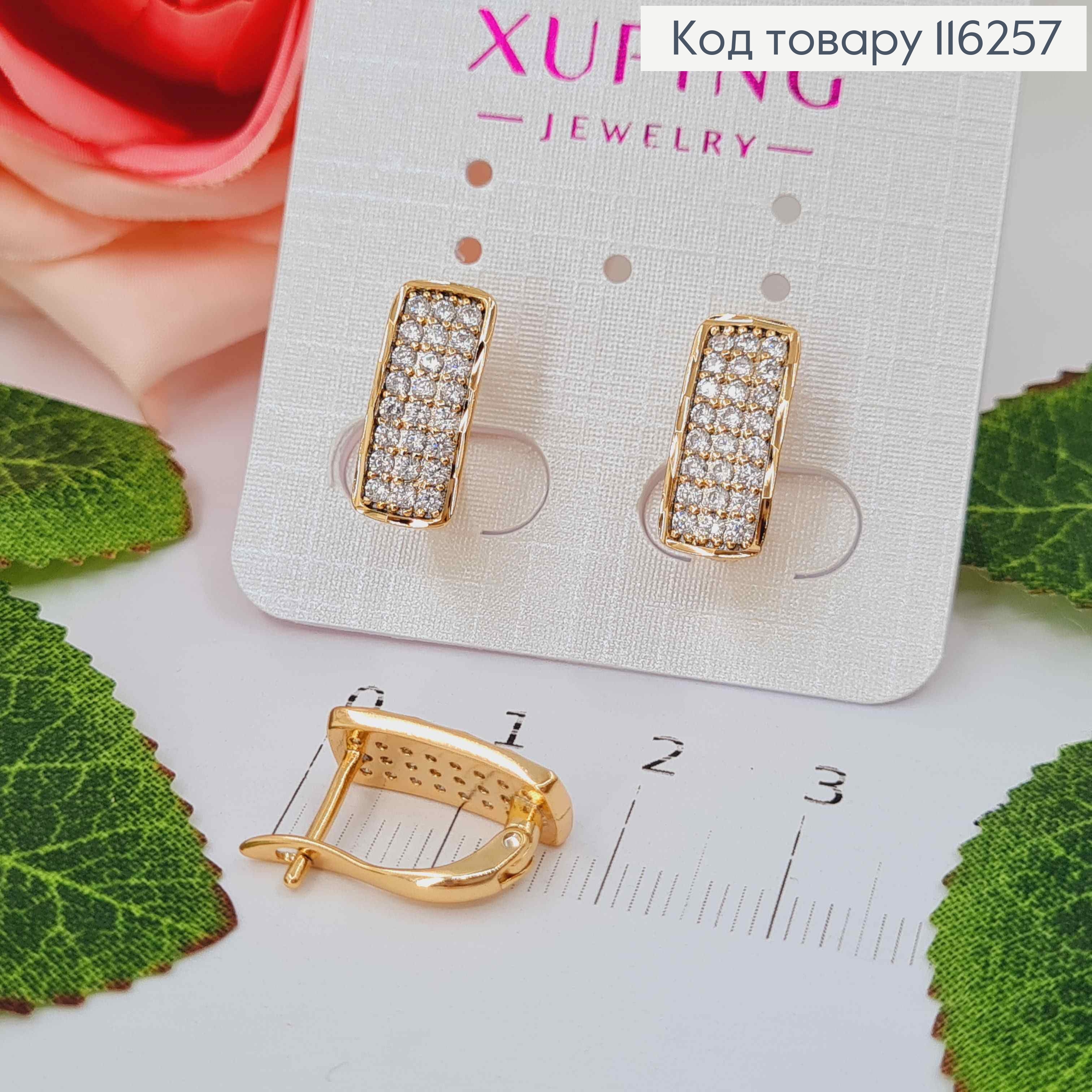 Серьги пластинки, с тремя рядами камешков в оправе, 1,4см, англ. застежка, Xuping18К