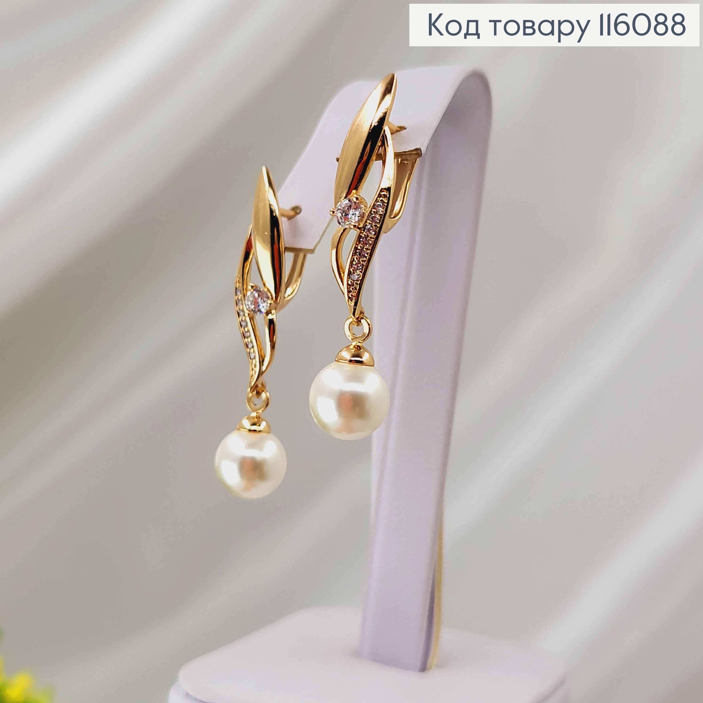 Серьги "Пламя" с камнем и подвеской жемчужиной, 3см., англ. застежка, Xuping 18K