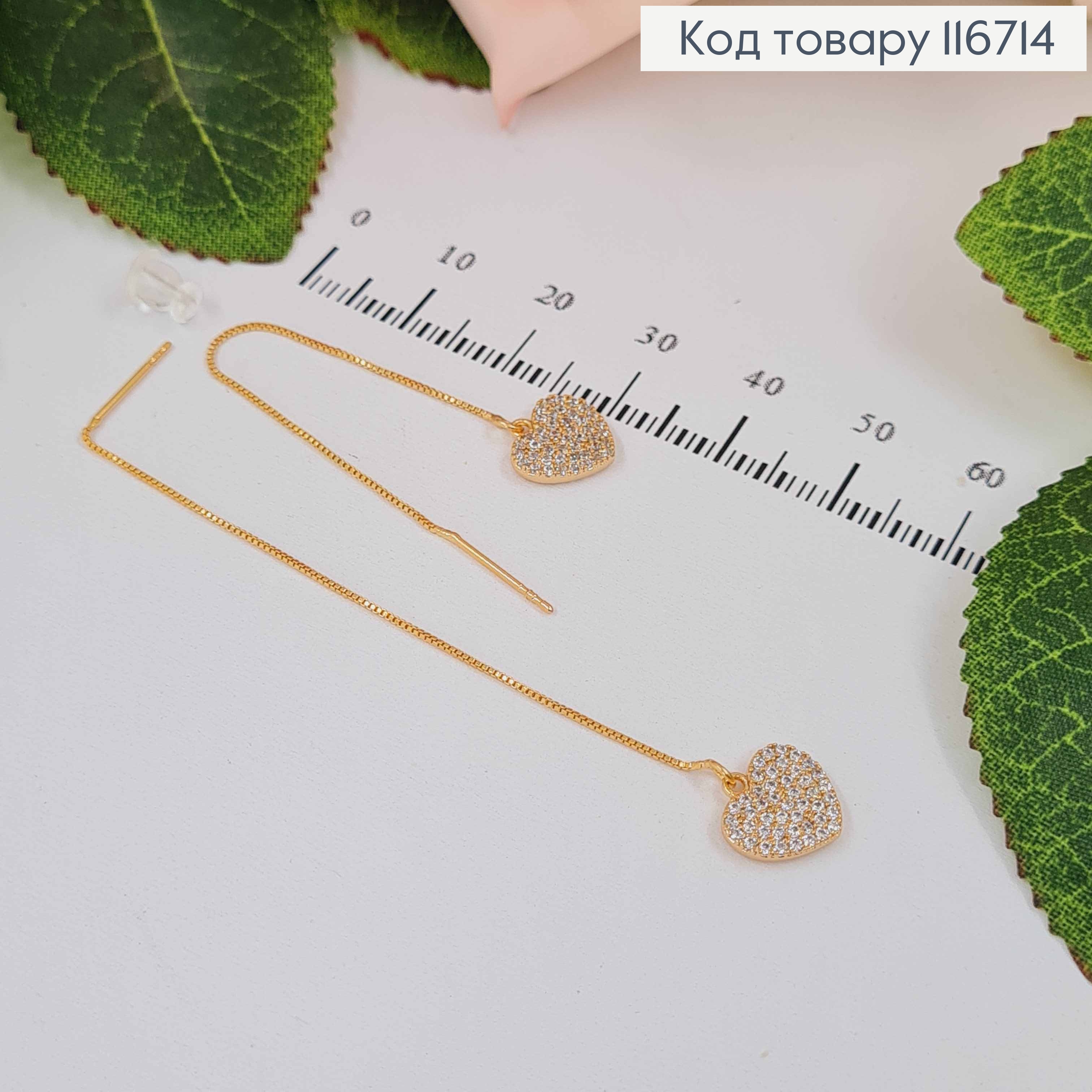 Серьги протяжки, с пластинкой сердечком, в камнях, 7см, Xuping 18K