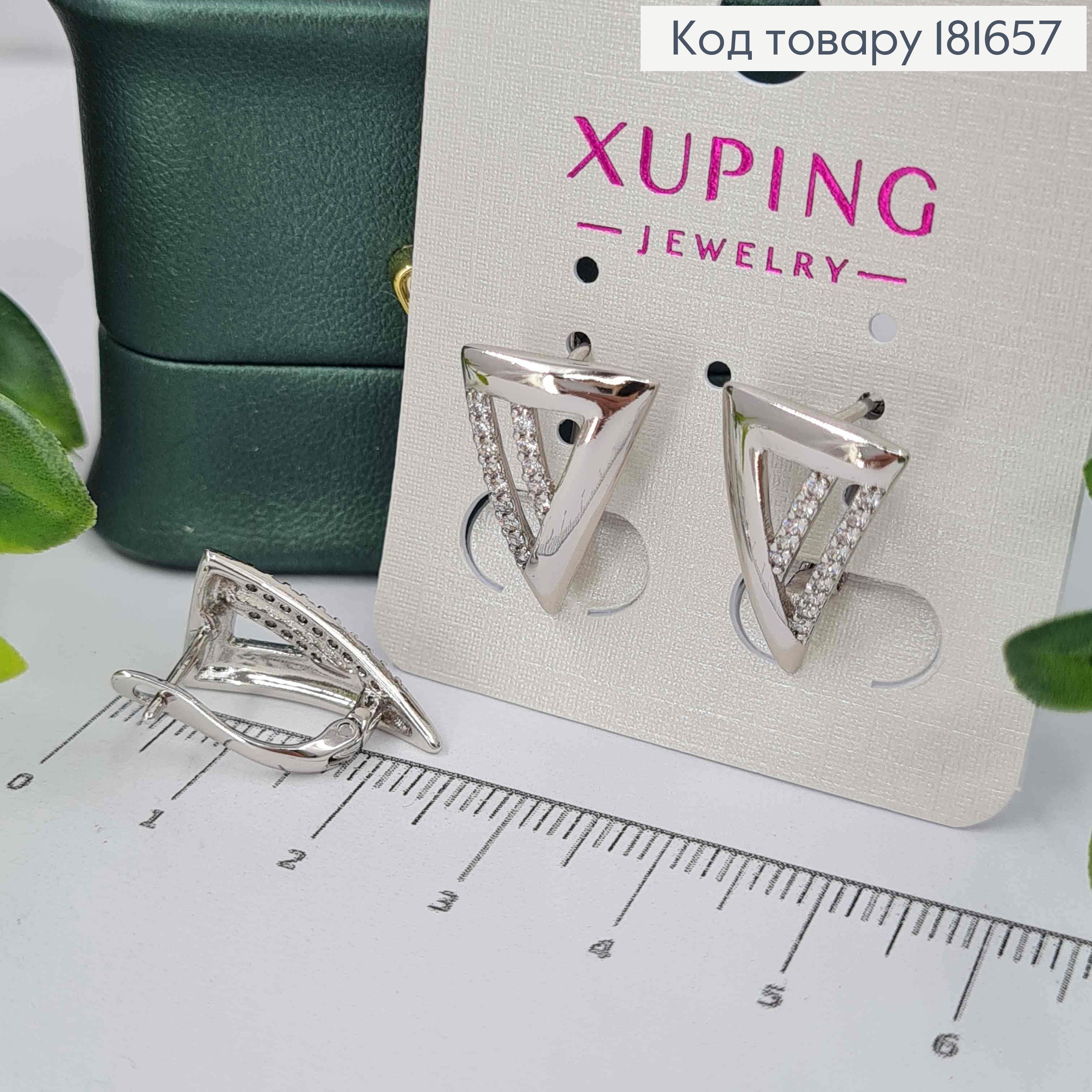 Серьги родованные "Треугольные" с Блестящими камешками, 2см, английская застежка, Xuping