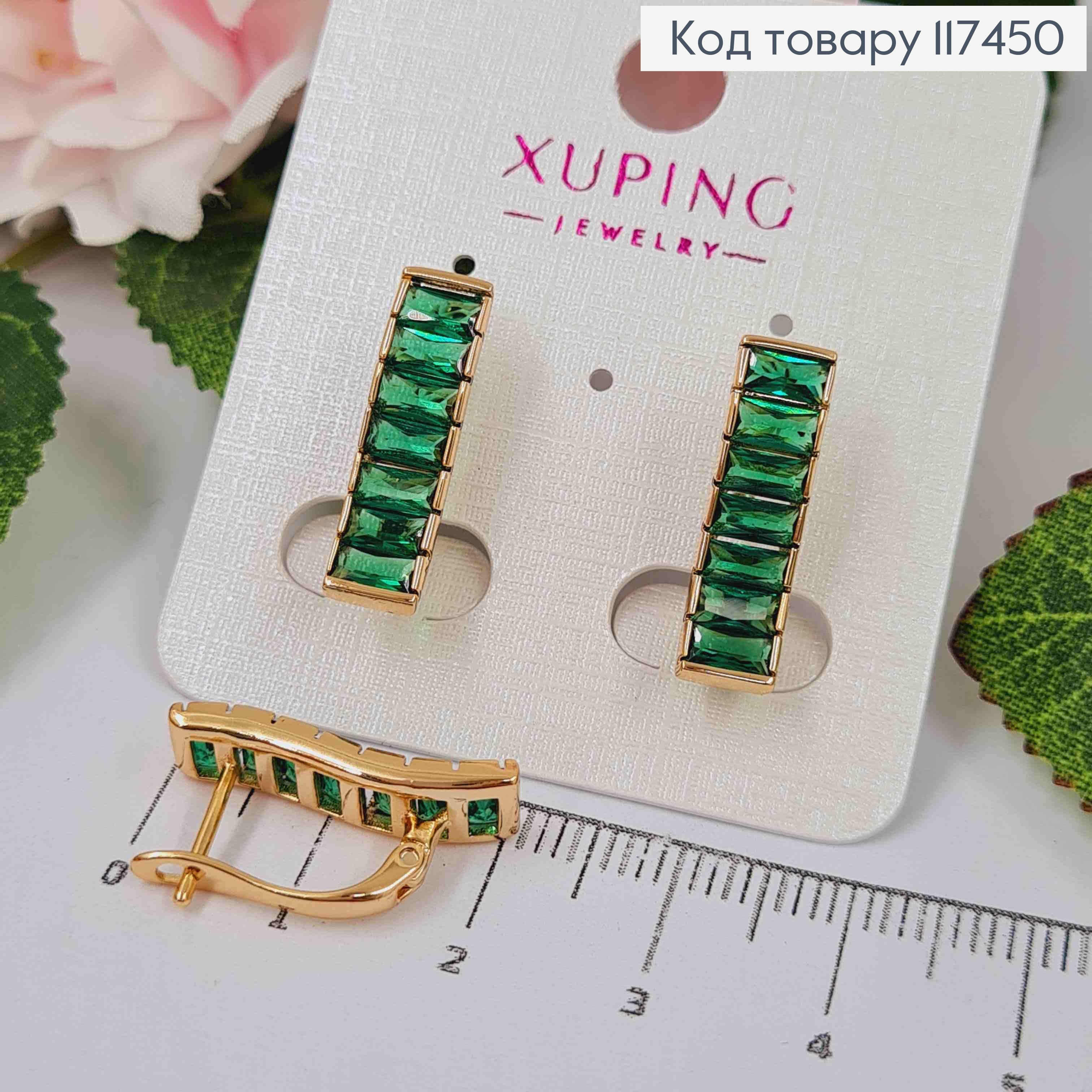 Серьги "ВЕЧНОСТЬ" с камнями в один ряд ЗЕЛЕНОГО цвета, дл. 2см, английский застежка, XUPING 18K