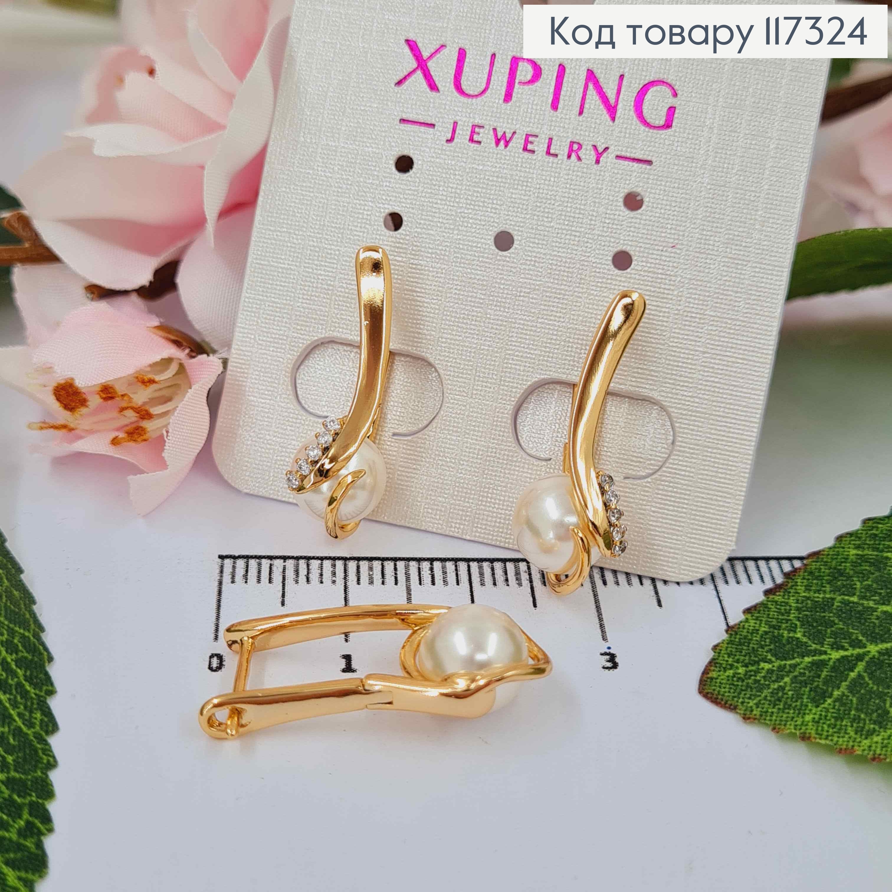 Серьги с жемчужиной окутанной завитками с камешками, дл. 2,5см, англ застежка, Xuping 18К