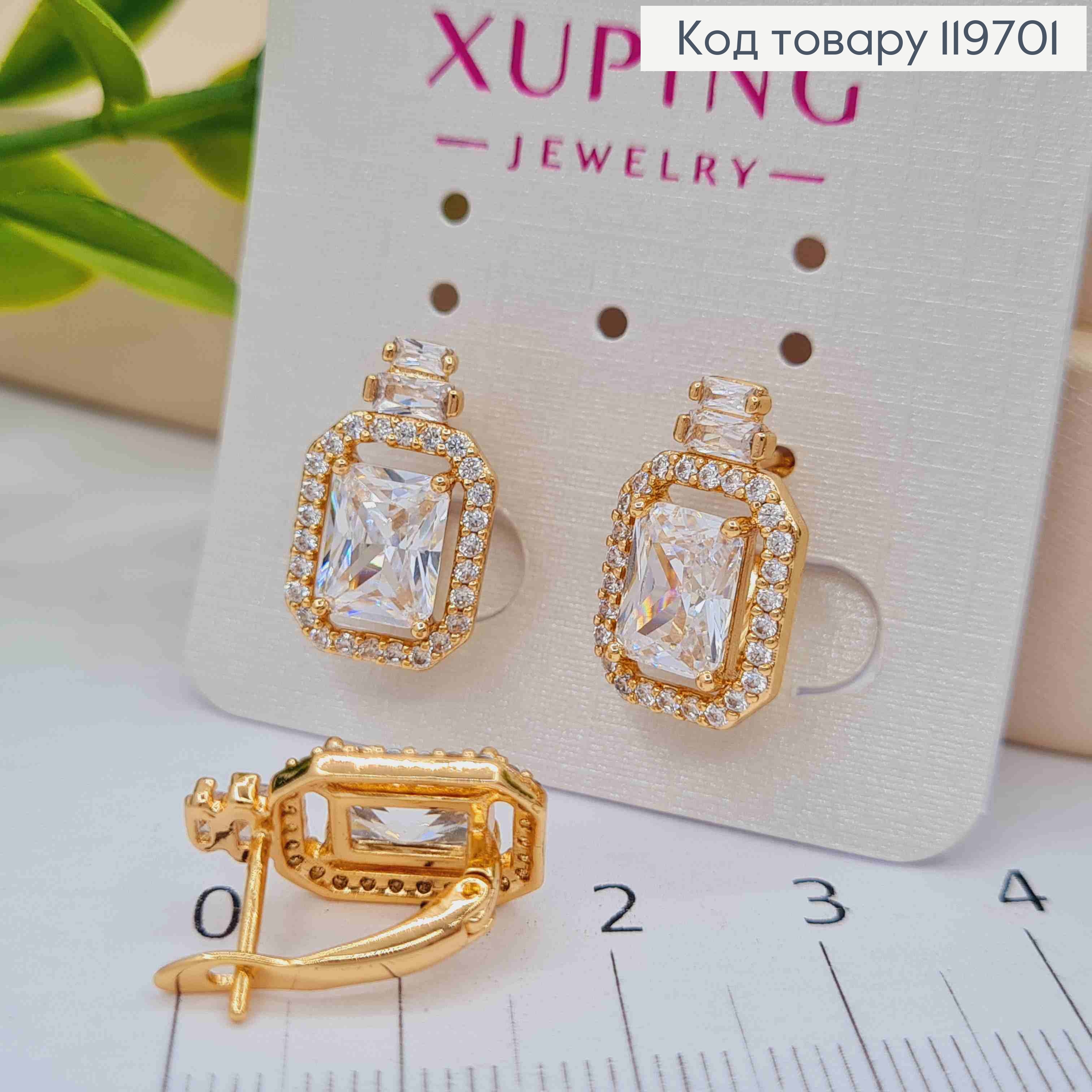 Серьги кольца "Прямоугольные" украшены Блестящими камешками, длиной 2,4см, застежка заколка, Xuping 18К 110199 фото