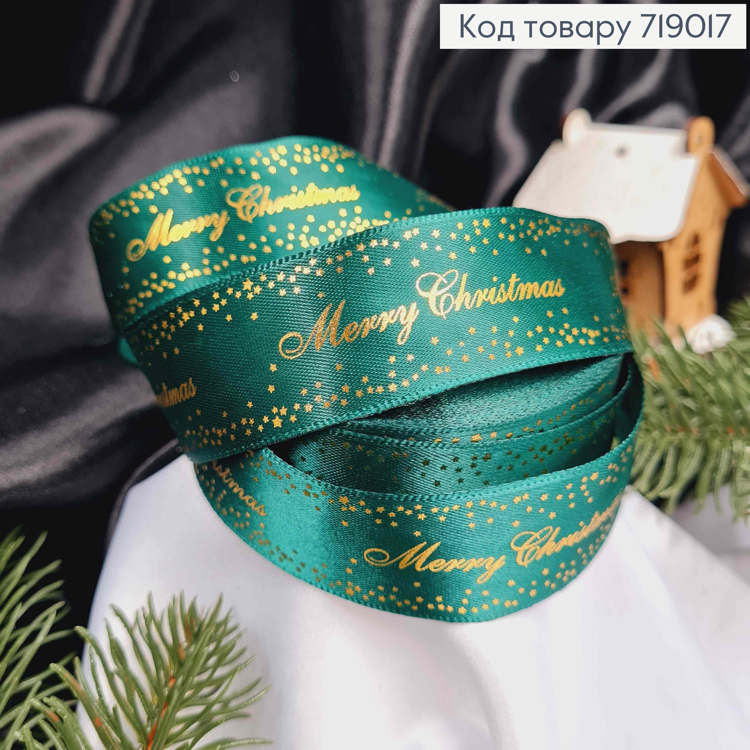 Лента атласная ЗЕЛЕНАЯ с принтом "Merry Christmas" золотого цвета, шир 2,5см, длина 25 ярдов (23м)