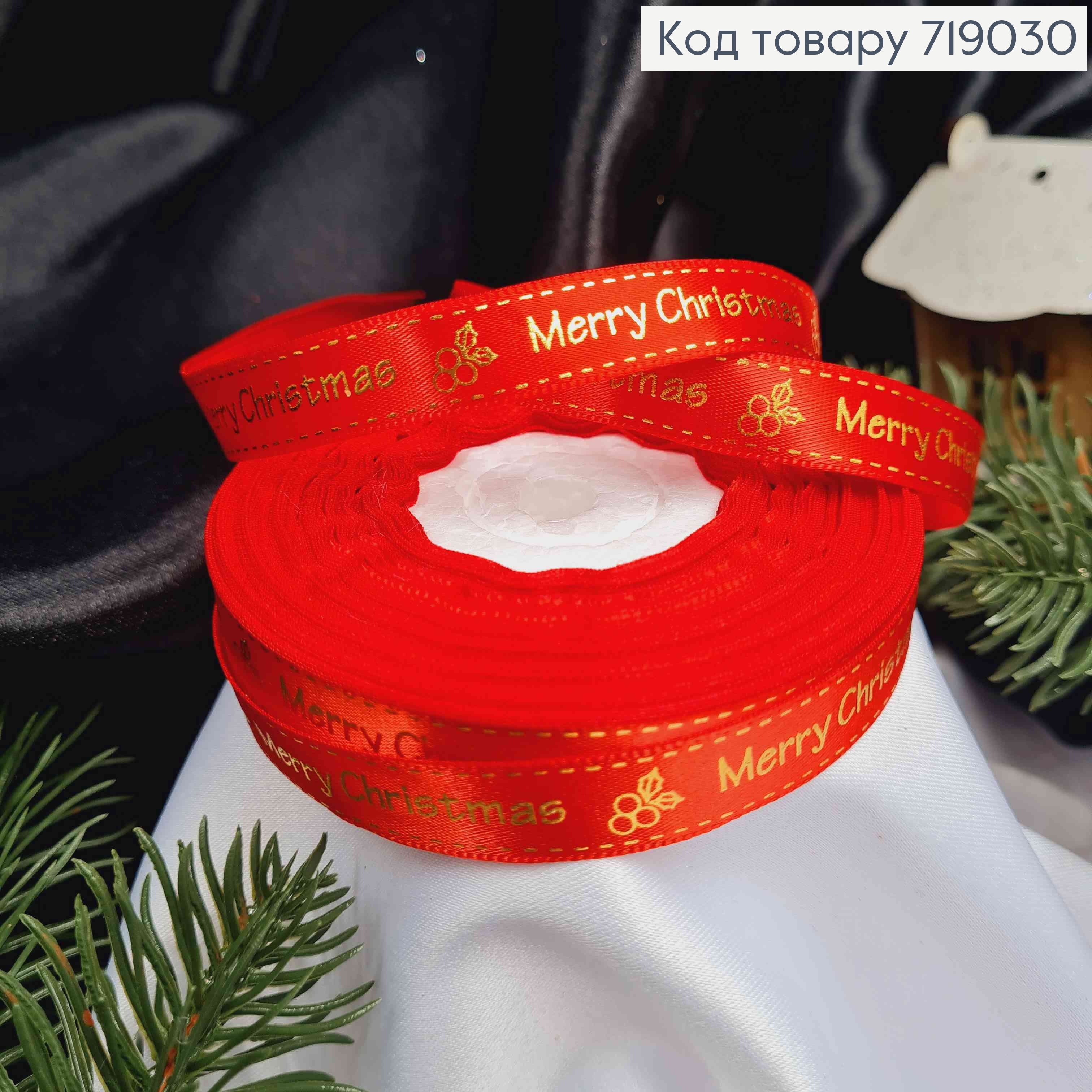 Лента атласная КРАСНАЯ с принтом "Merry Christmas", ширина 1,5см, длина 25 ярдов (23м)
