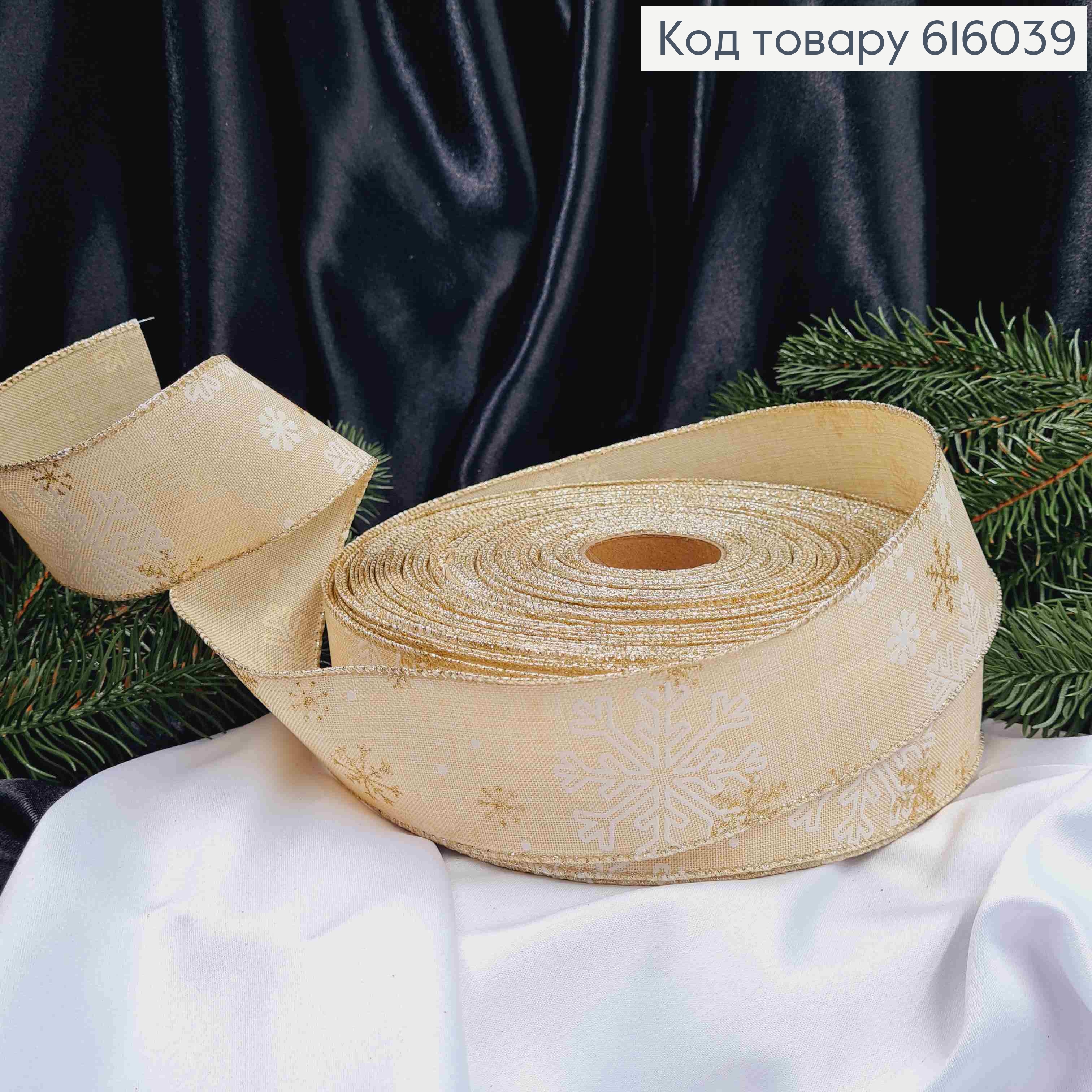 Лента органза КРЕМОВА с принтом "Снежинки" золотого цвета, ширина 2,5см, длина 25 ярдов (23м) 719018 фото