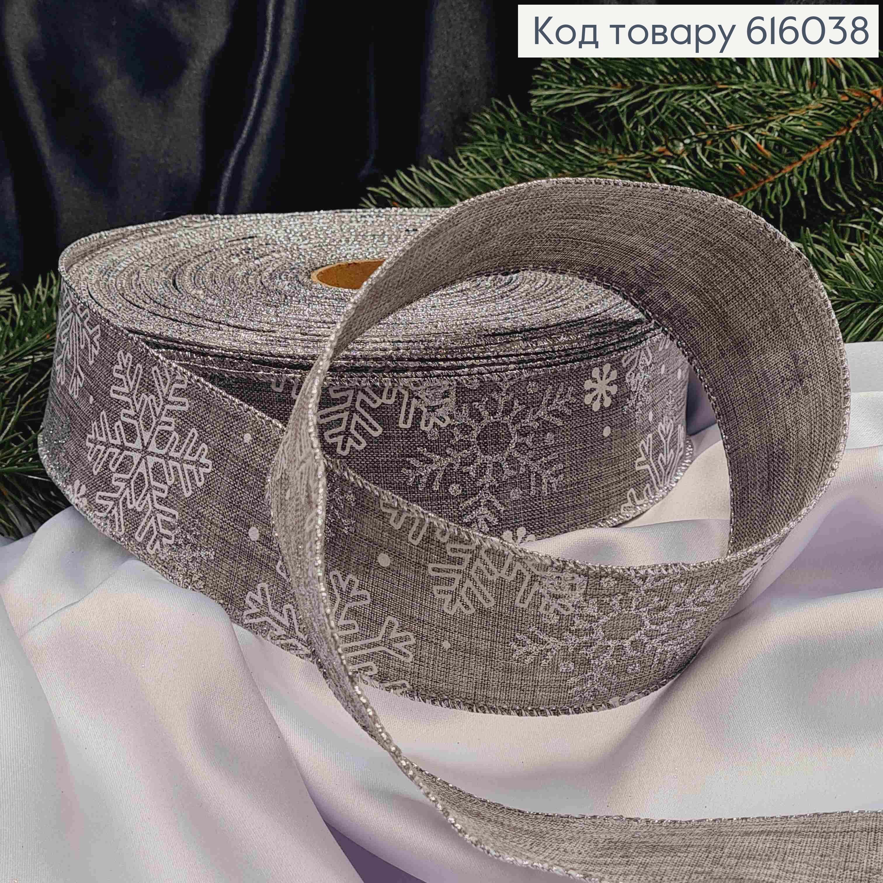 Лента-лен СЕРА с Серебряными Снежинками, ширина 5см, длина 50 ярдов (45м)