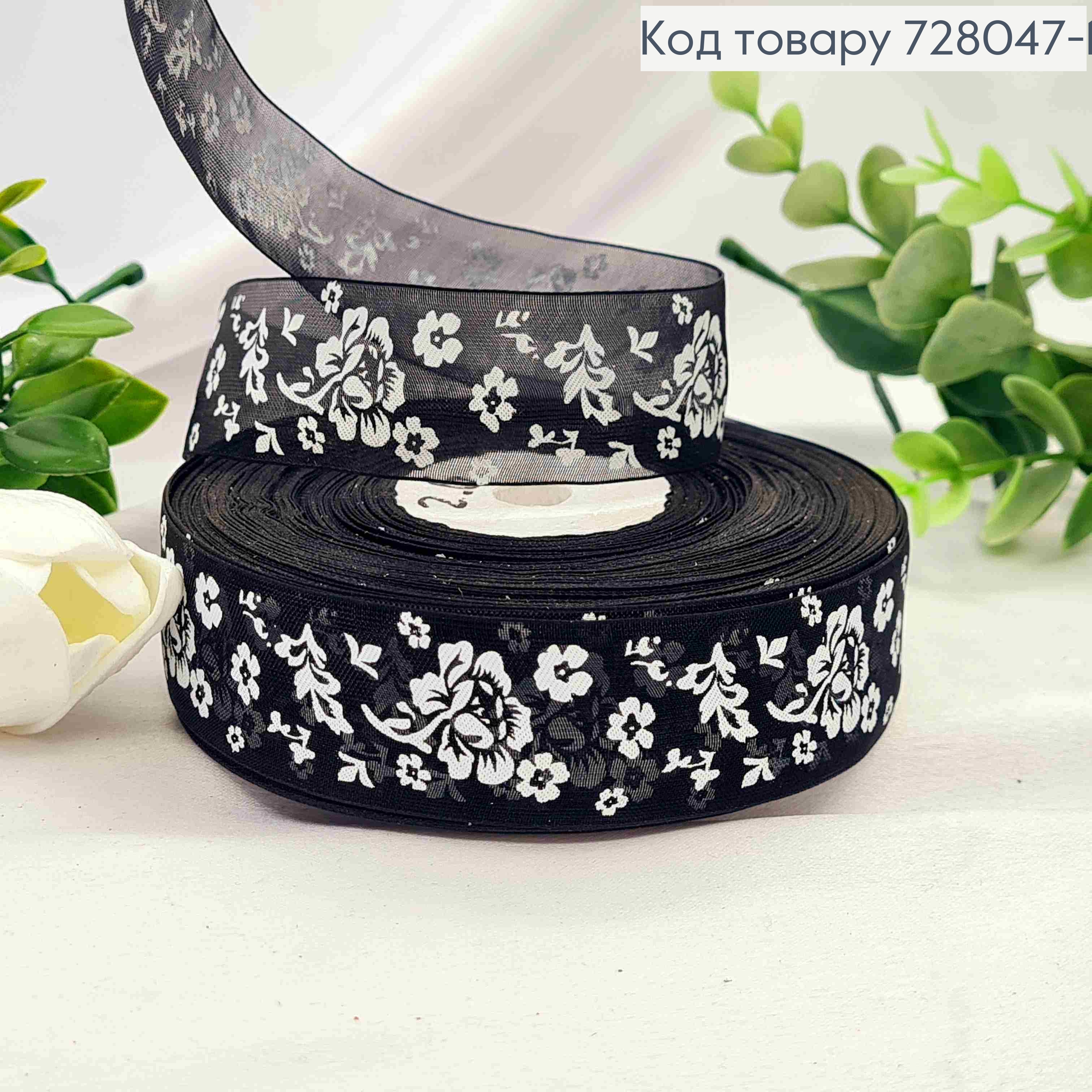 Лента органза, ЧЕРНАЯ с принтом "Белые Цветы", шир 2,5см, длина 45ярдов (41м)