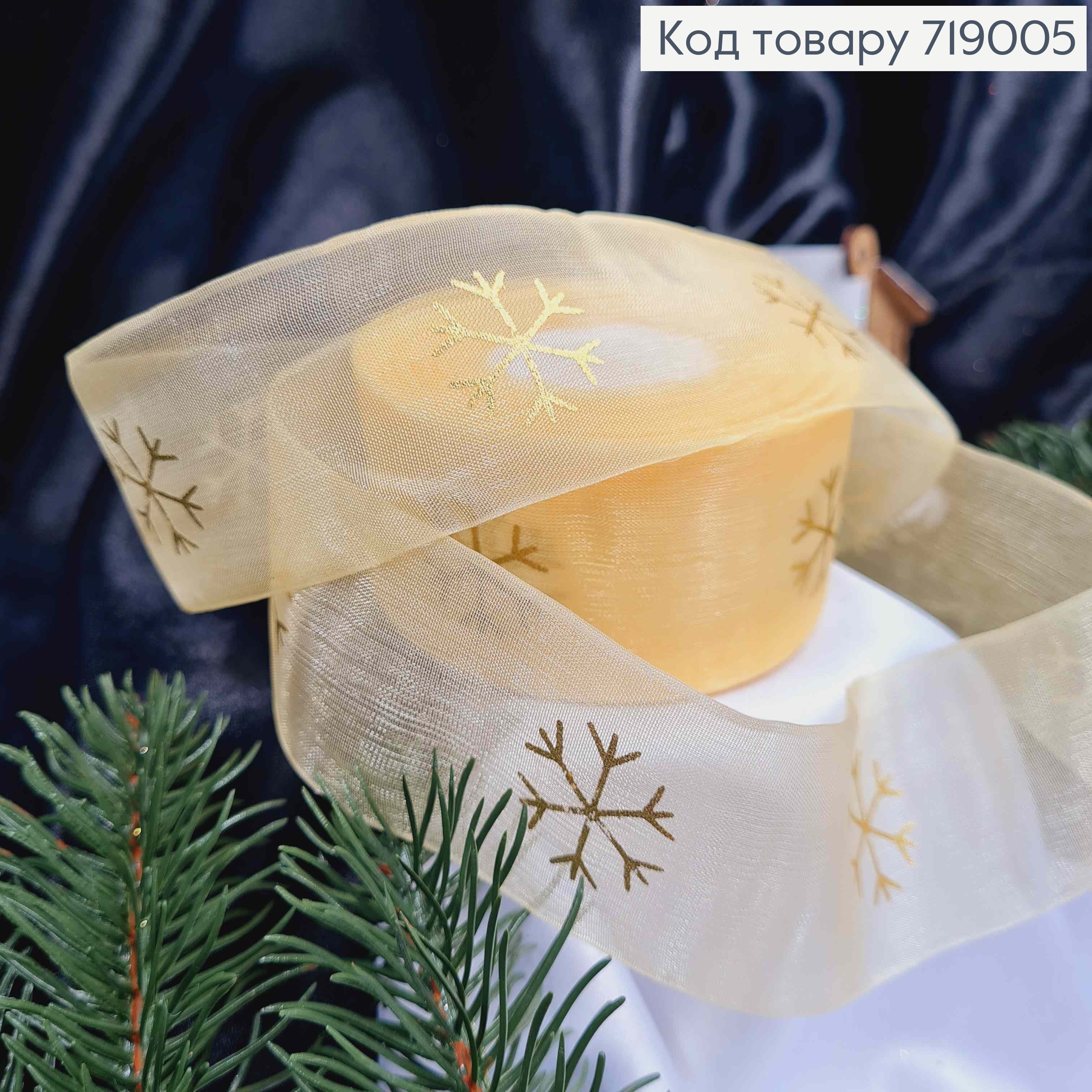 Лента органза КРЕМОВА с принтом "Снежинки" золотого цвета, ширина 1,3см, длина 25 ярдов (23м) 719037 фото