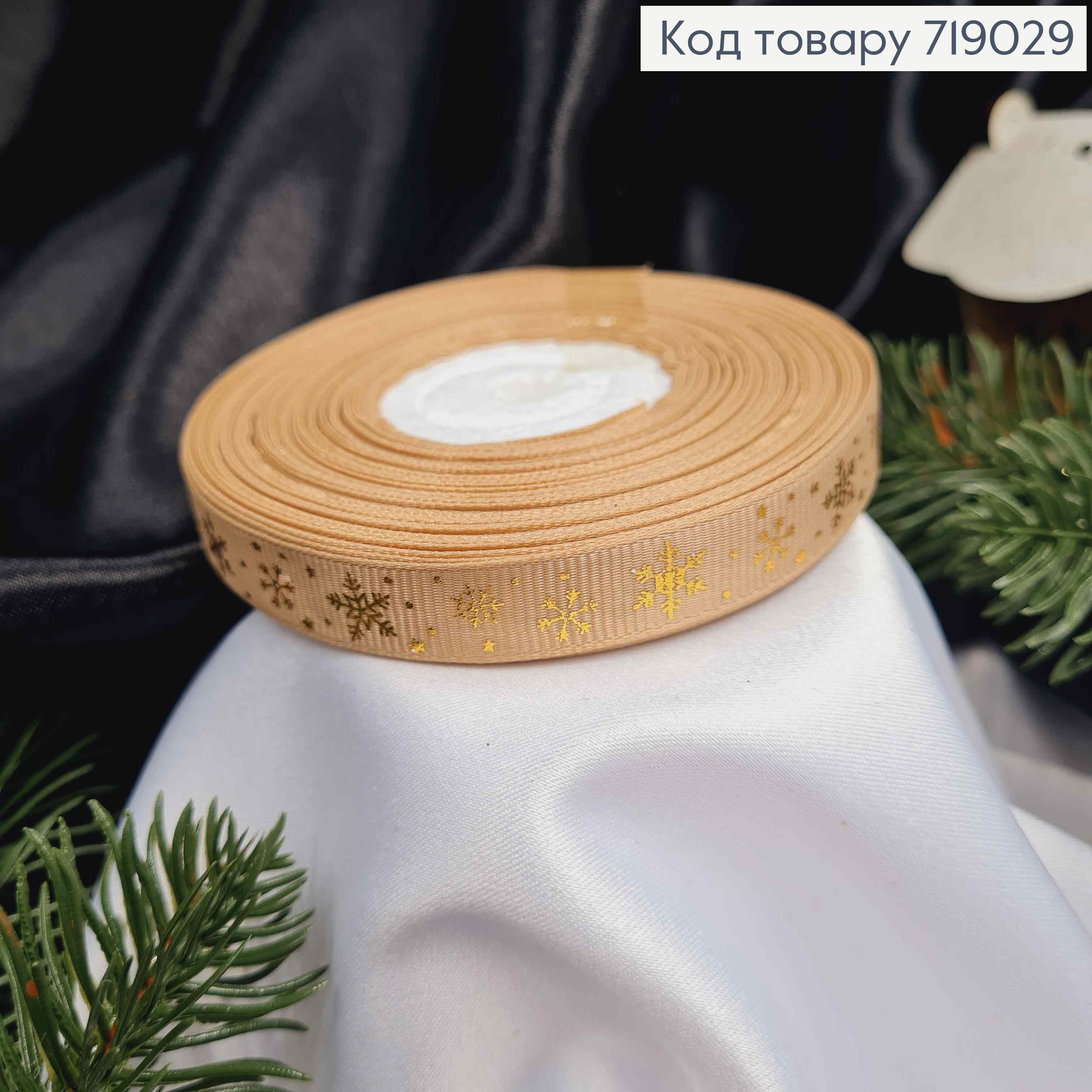 Лента репсовая БЕЖЕВАЯ с принтом "Снежинки" золотого цвета, ширина 1,5см, длина 25 ярдов (23м)