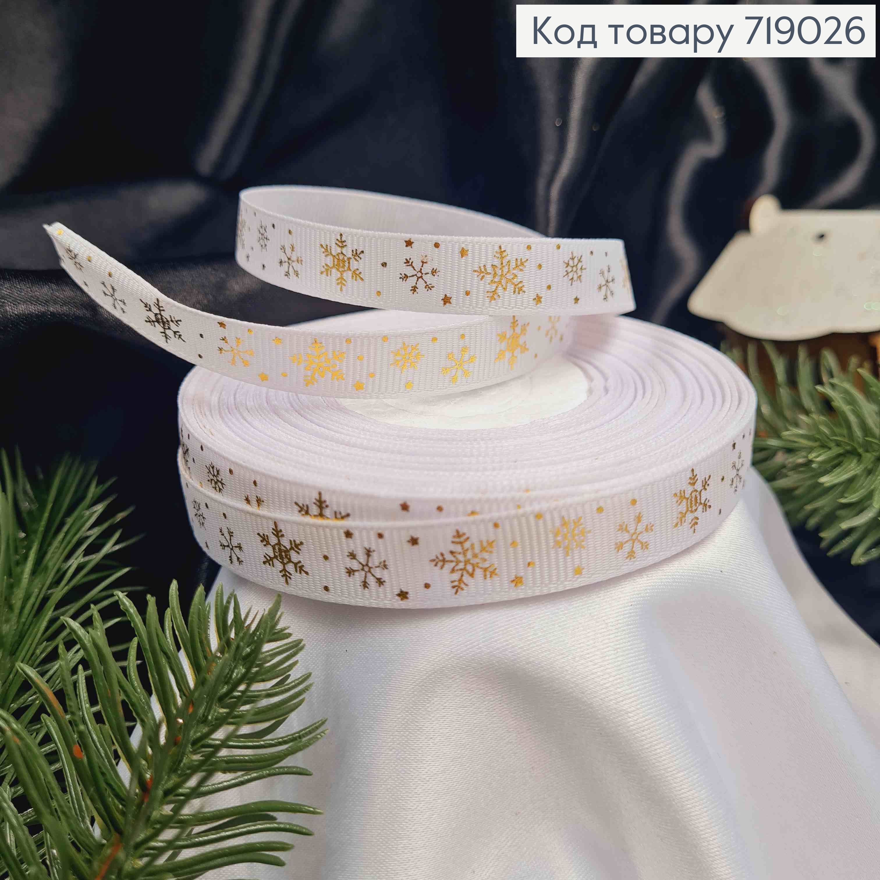 Лента репсовая БЕЛАЯ с принтом "Снежинки" золотого цвета, ширина 1 см, длина 25 ярдов (23м)