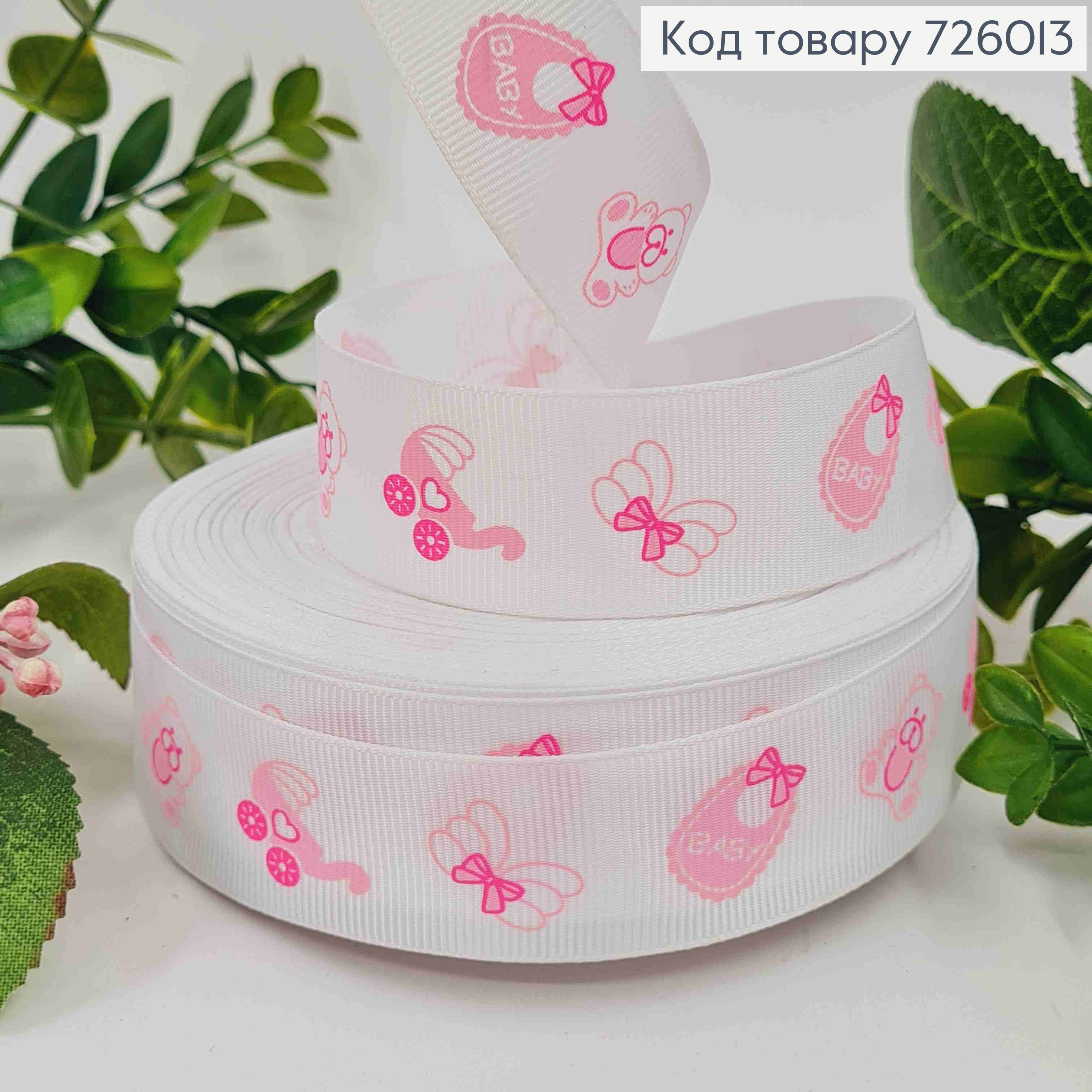Лента репсовая, БЕЛАЯ с Розовым "Baby" принтом, ширина 2,5см, длина 25 ярдов (23метра)