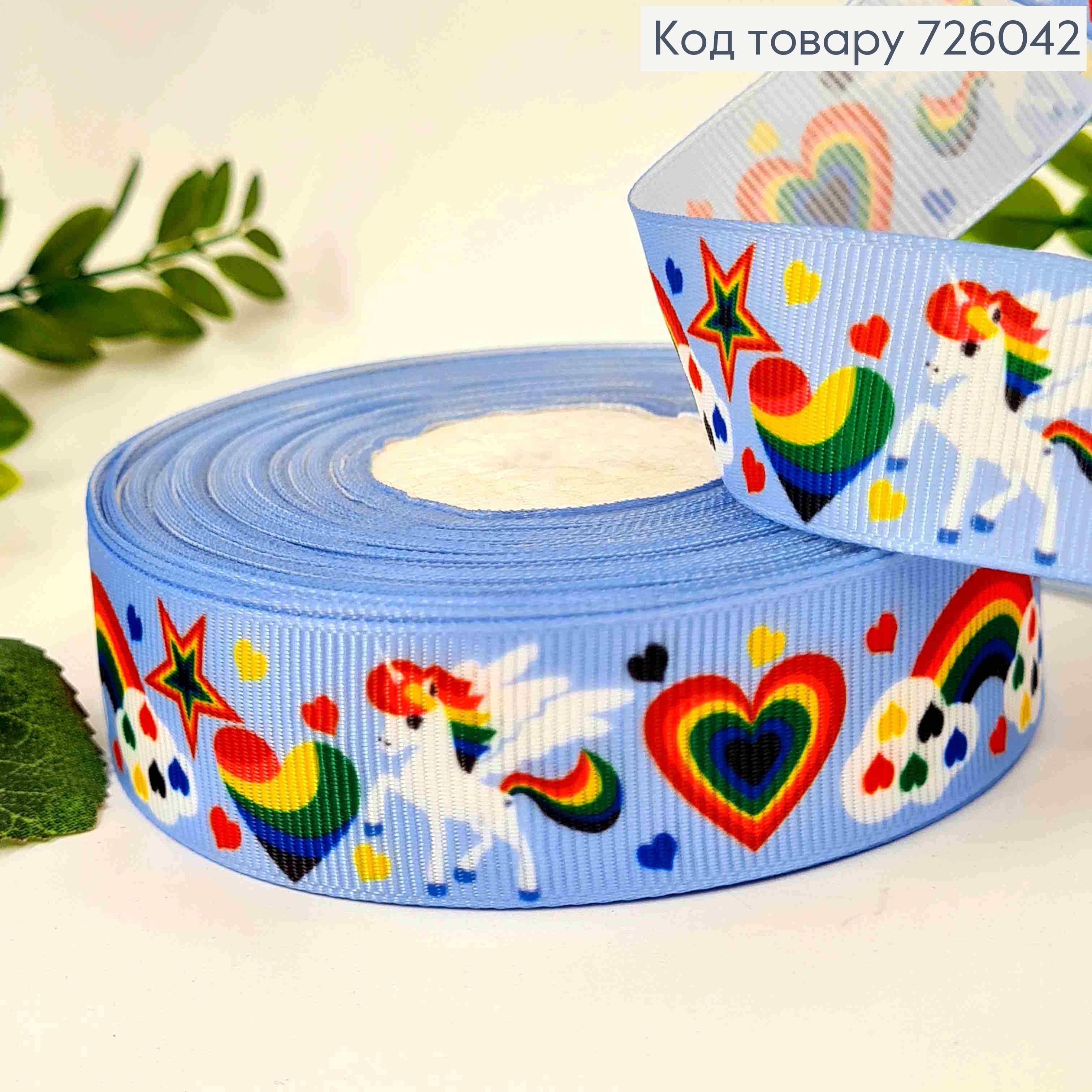 Лента репсовая, ГОЛУБАЯ с принтом "Единорог", ширина 2,5см, длина 25 ярдов(23м)