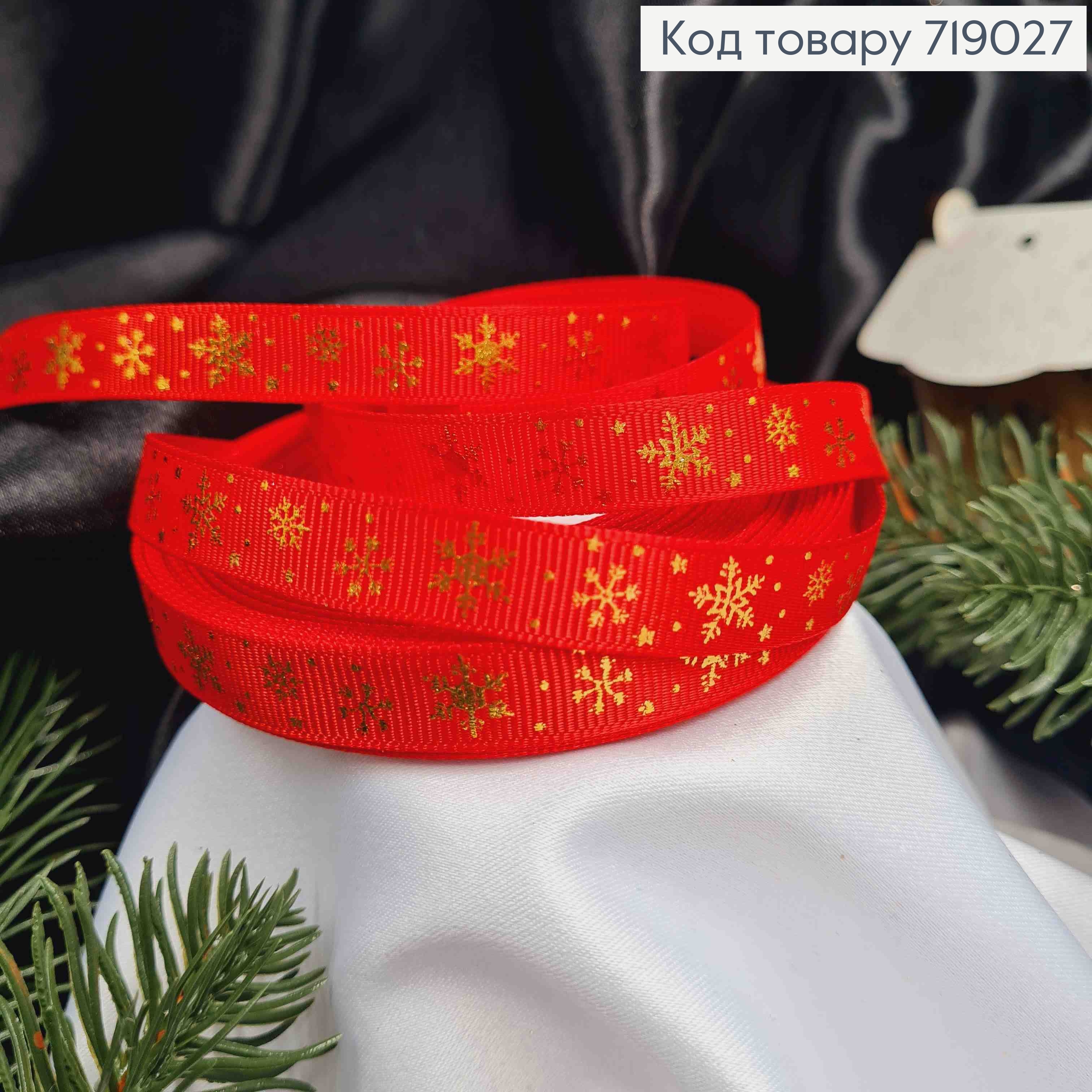 Лента репсовая КРАСНАЯ с принтом "Снежинки" золотого цвета, ширина 1,5см, длина 25 ярдов (23м)