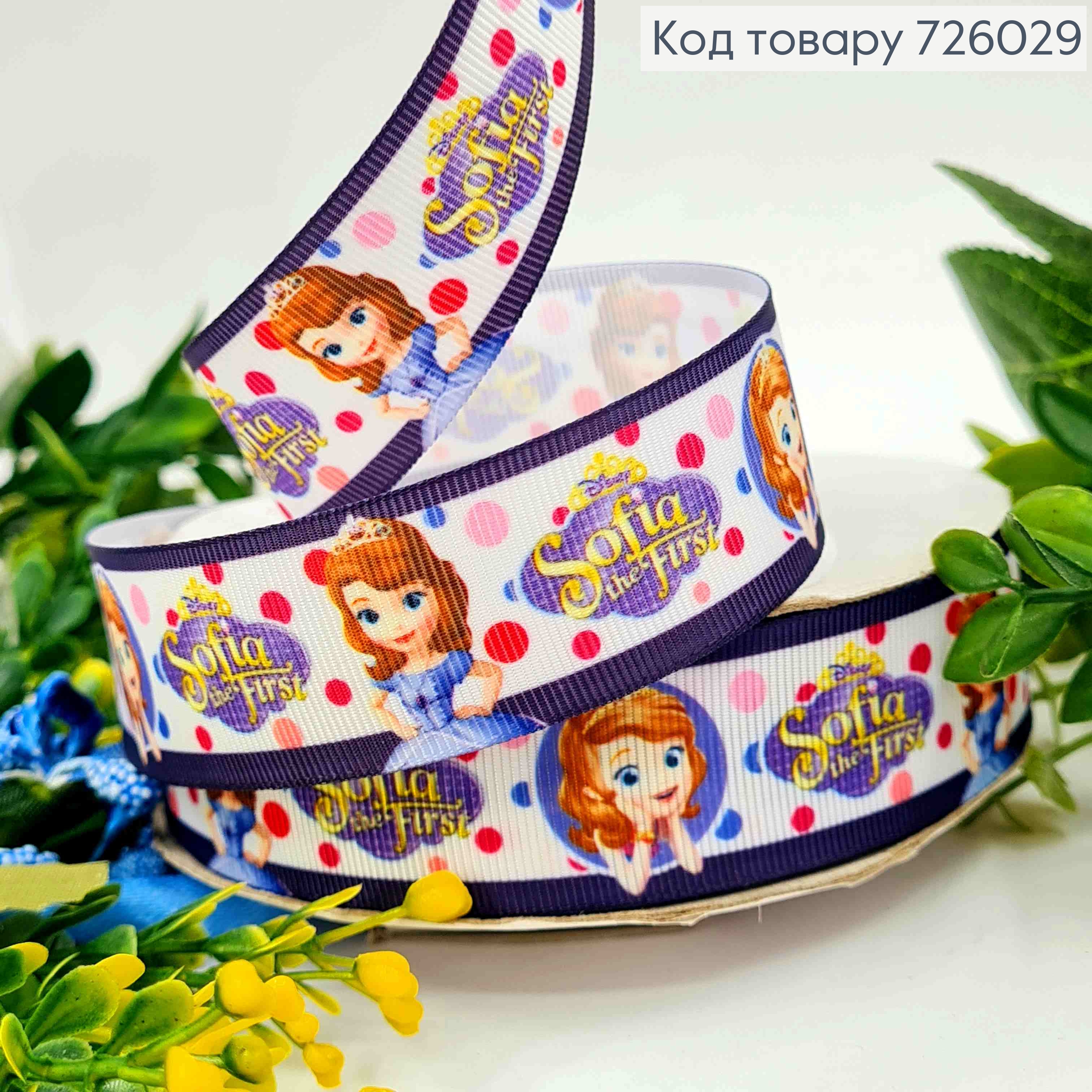 Лента репсовая, с принтом "Принцесса СОФИЯ", ширина 2,5см, длина 25 ярдов(23м)