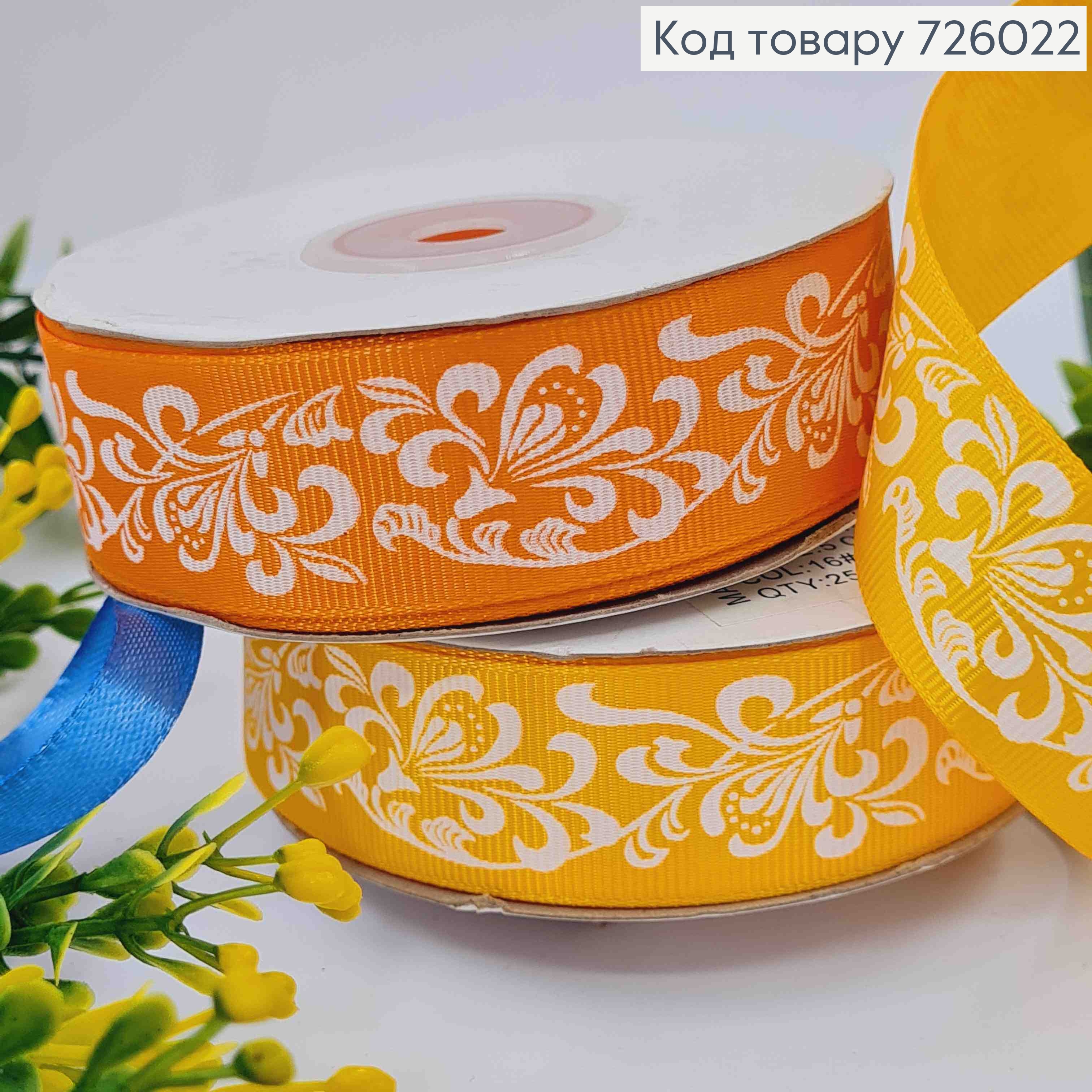 Лента репсовая, ЖЕЛТАЯ/ОРАЖЕВАЯ с принтом "Цветы" (в ассорт), шир 2,5см, длина 25 ярдов (23м)