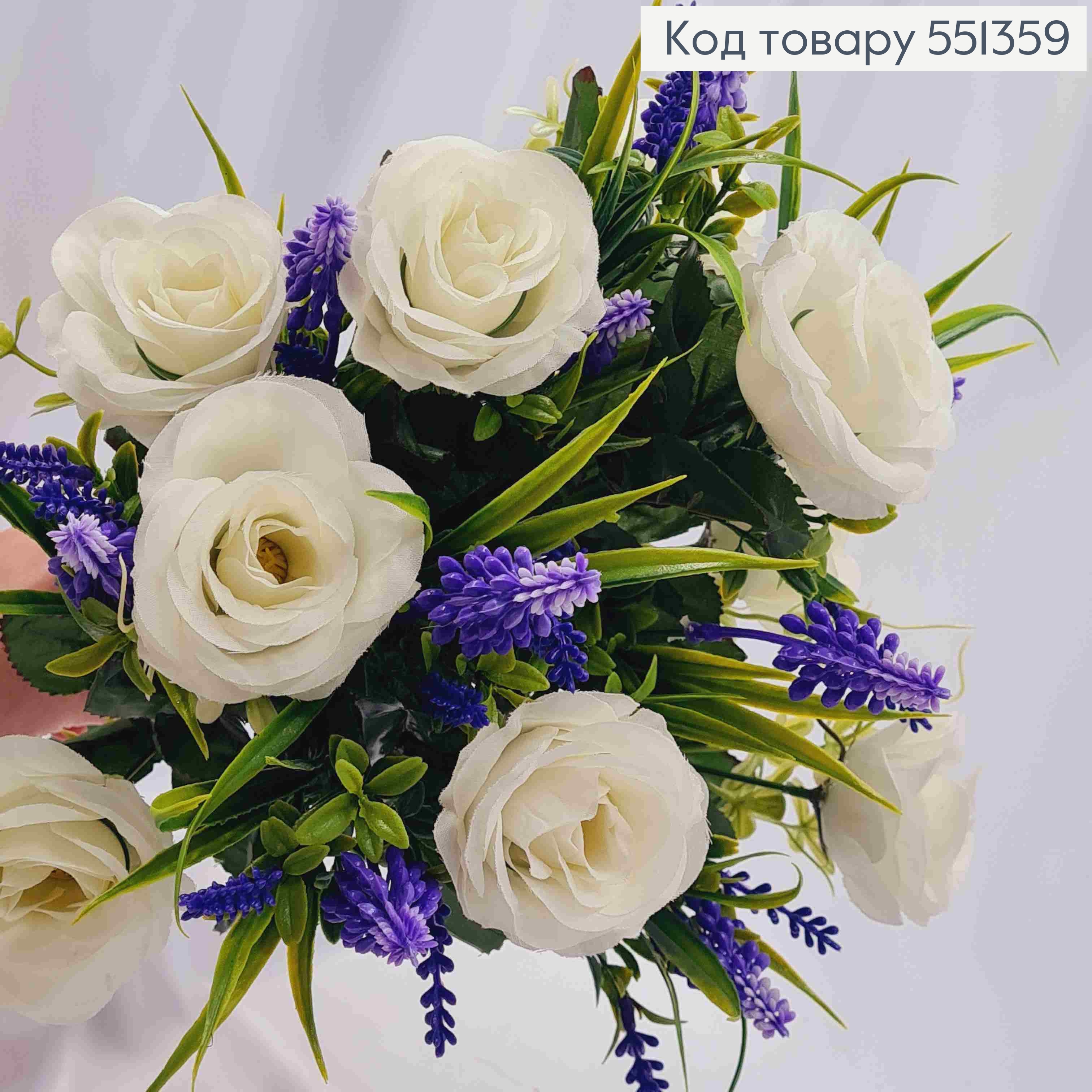 Искусственная композиция Белые розы с лавандой, 18 веток с цветами на металлическом стержне, 42см.