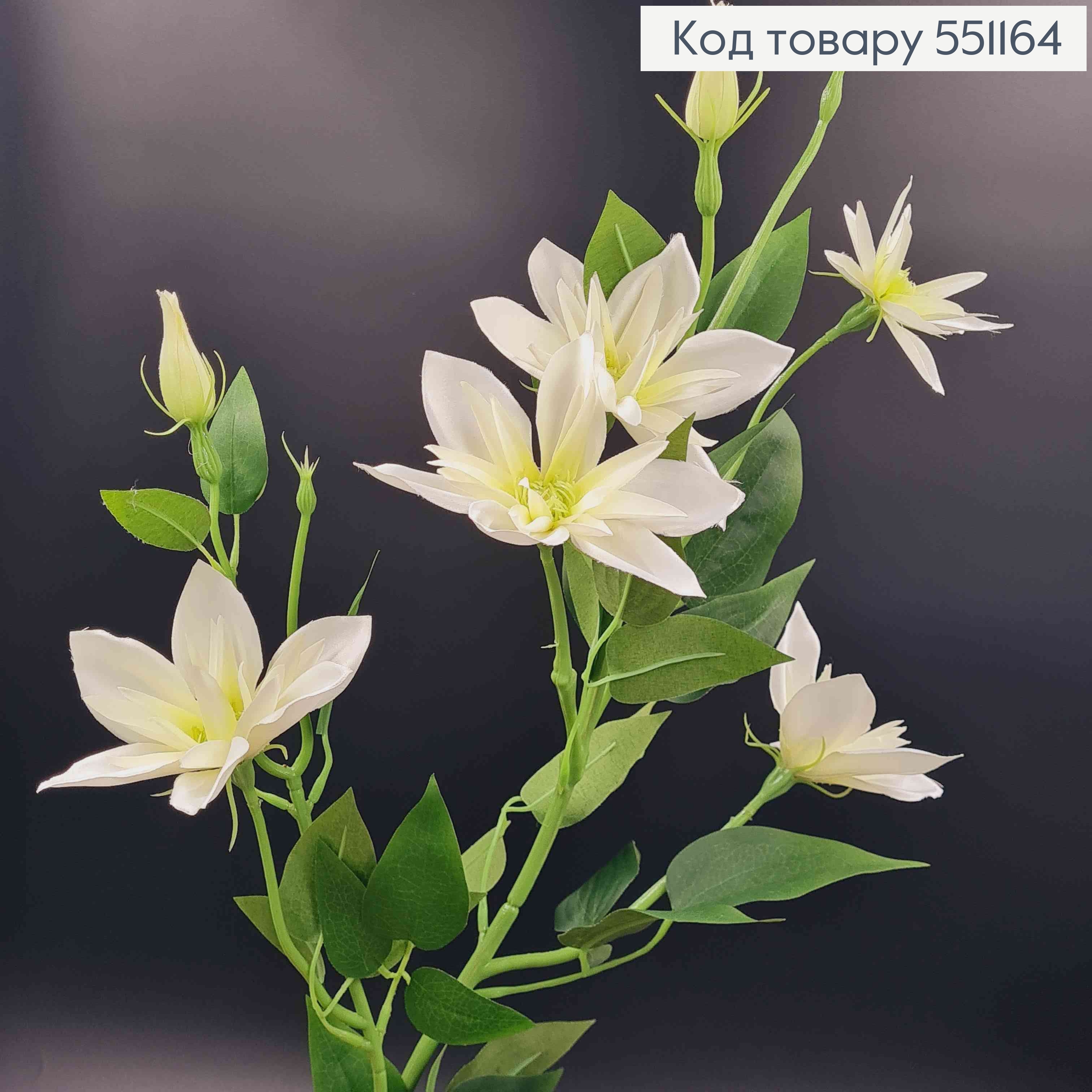 Искусственный цветок Клематиса, МОЛОЧНАЯ, 5 цветков + 2 бутона, на металлическом стержне, 83см