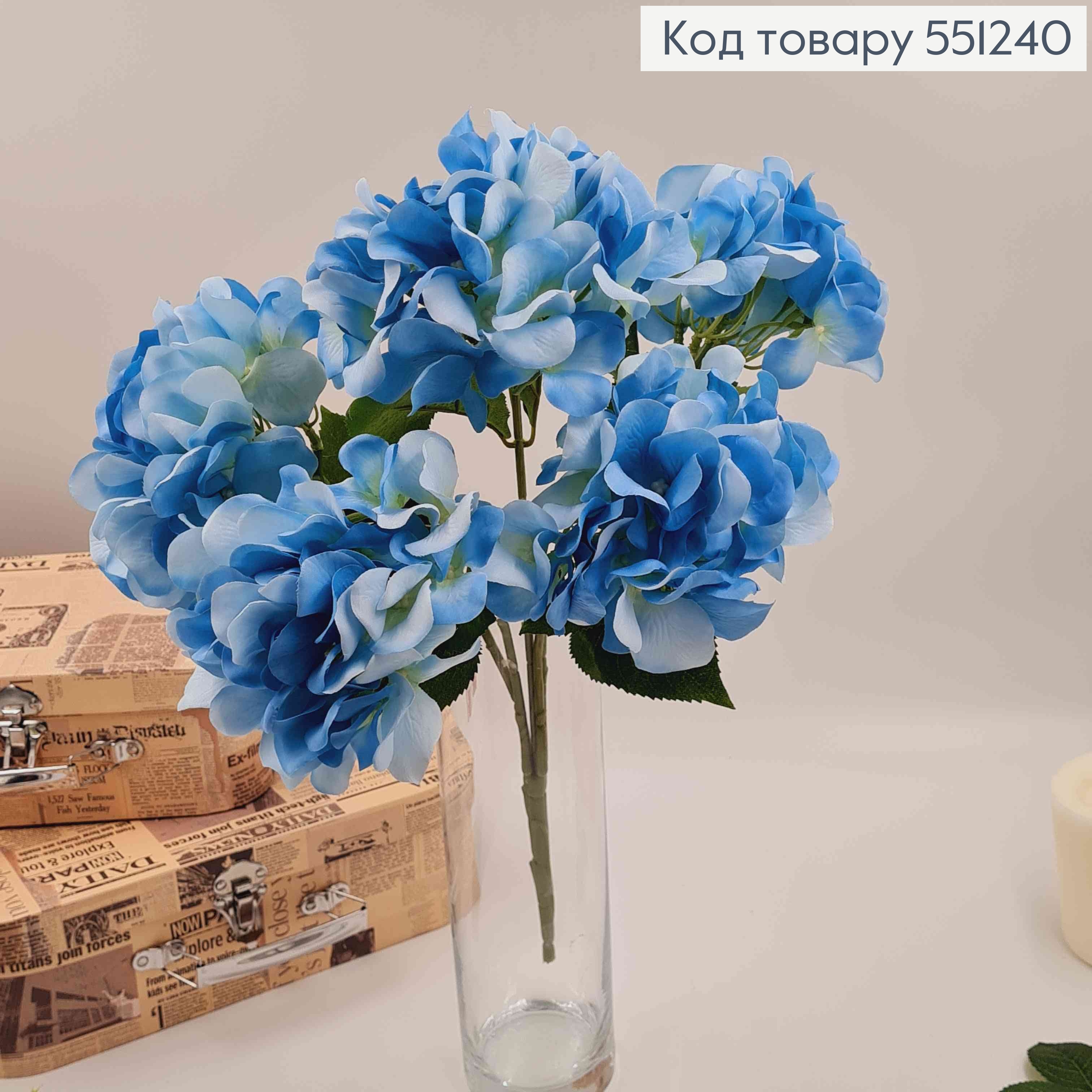 Искусственные цветы. Ветвь ГОЛУБАЯ гортензия (5 пучков), высотой 46 см, диаметр одного цветочка 7см.