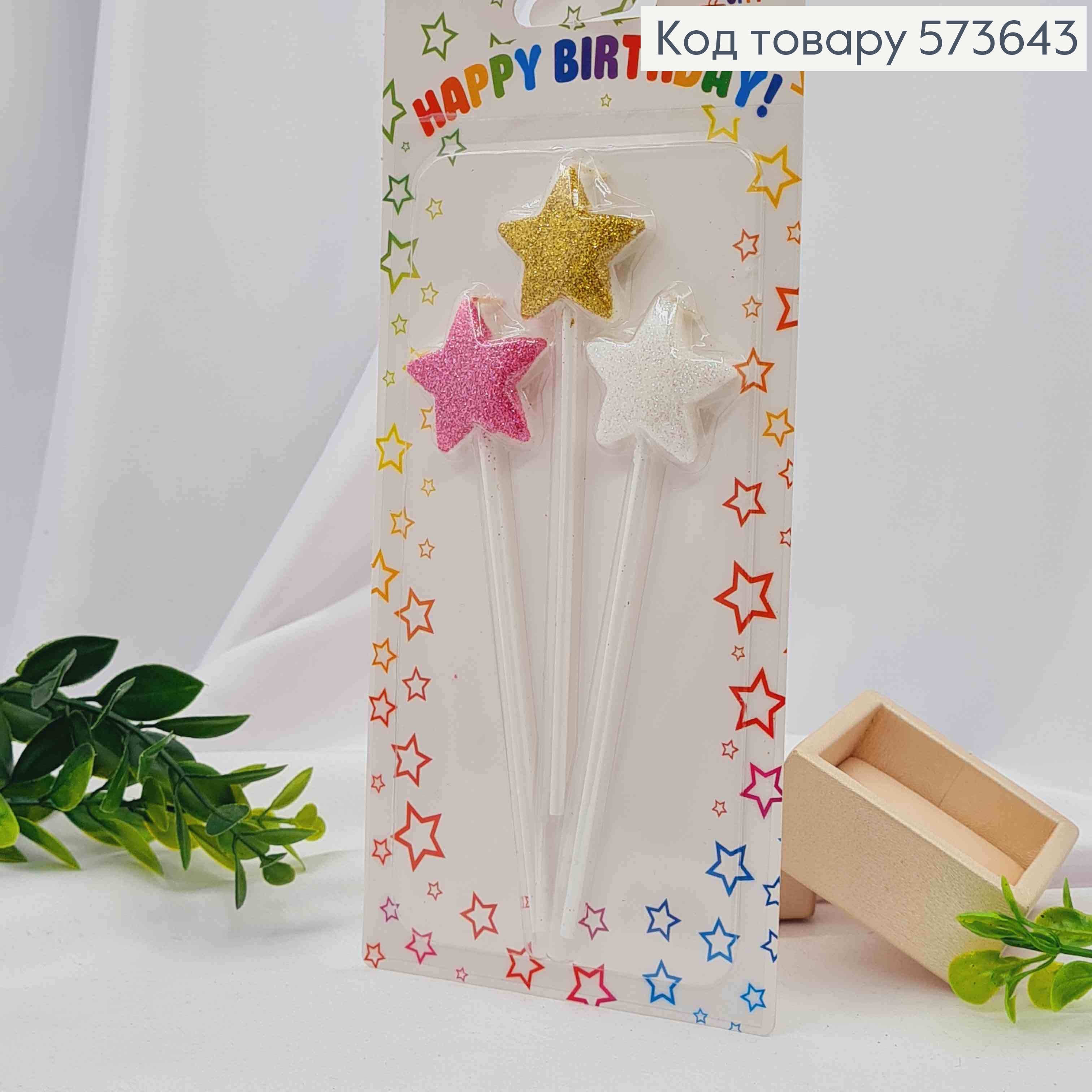 Свечи для торта "Звездочки", Разноцветные с глитером, 3шт/уп., 3,5+10см 573644 фото