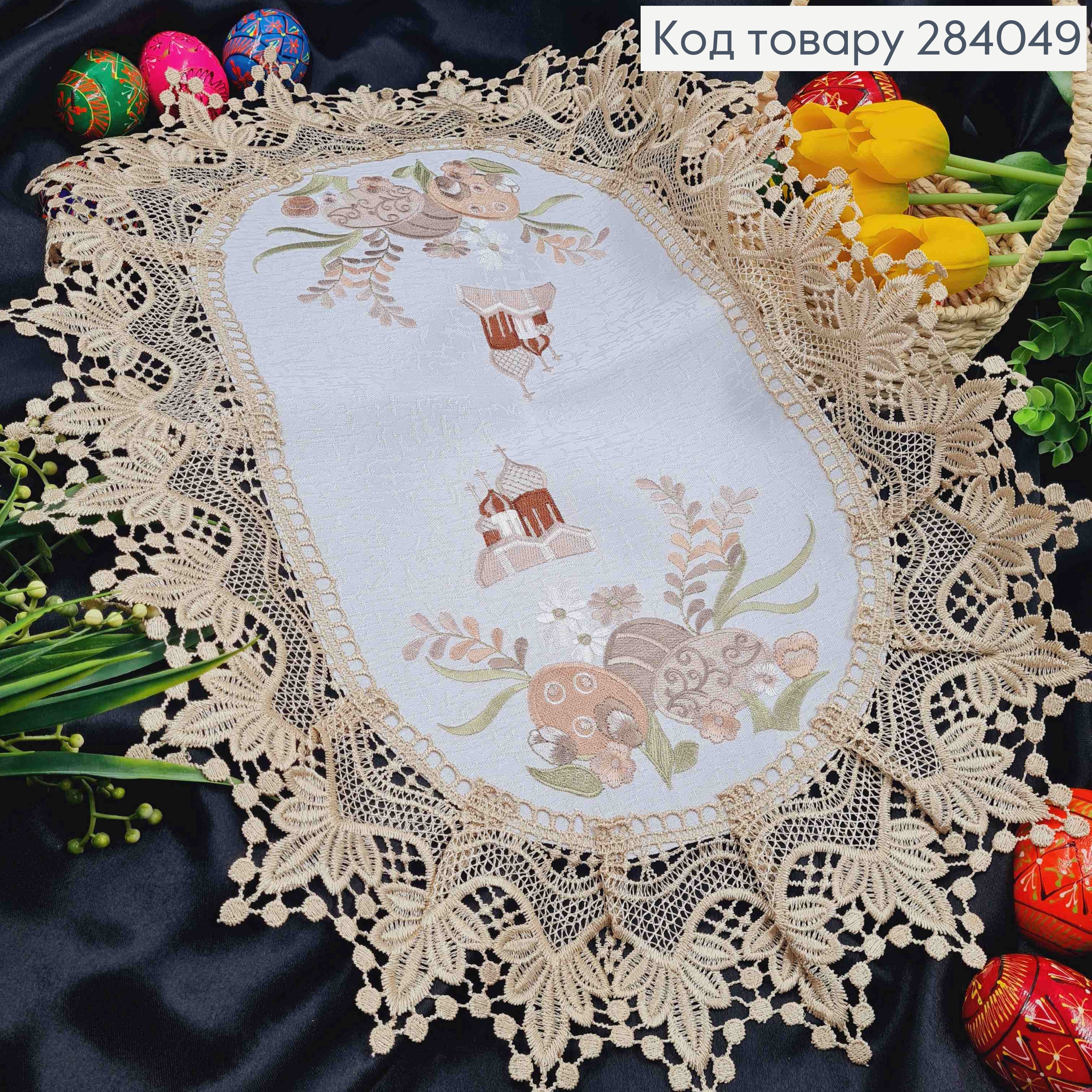 Пасхальная салфетка БЕЛАЯ, с Бежевым кружевом и вышивкой "Красанки и Церковь", овальная 40*60см