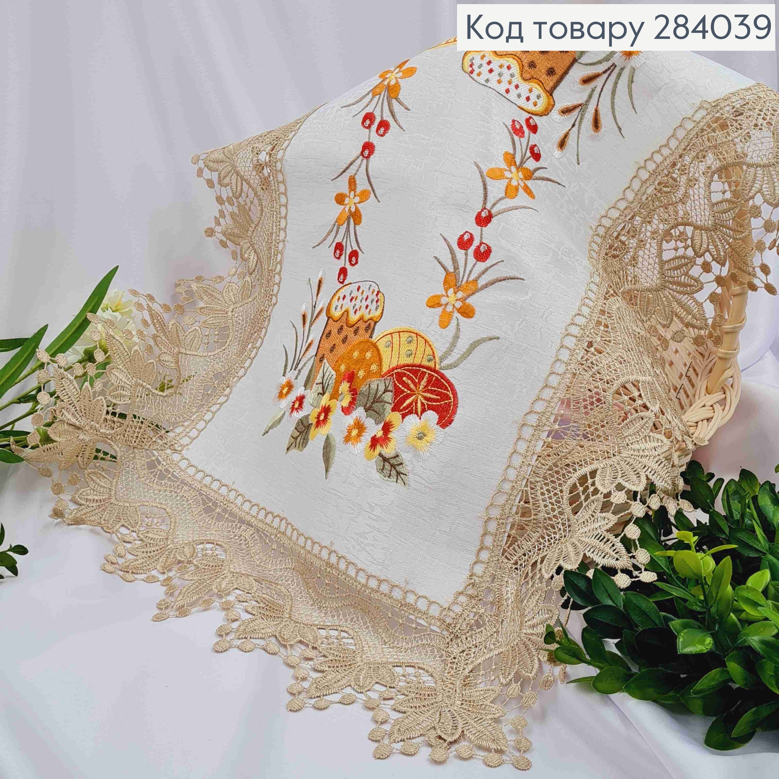 Пасхальная салфетка, с коричневым кружевом "Паска с писанками в цветах", квадратная 40*60см