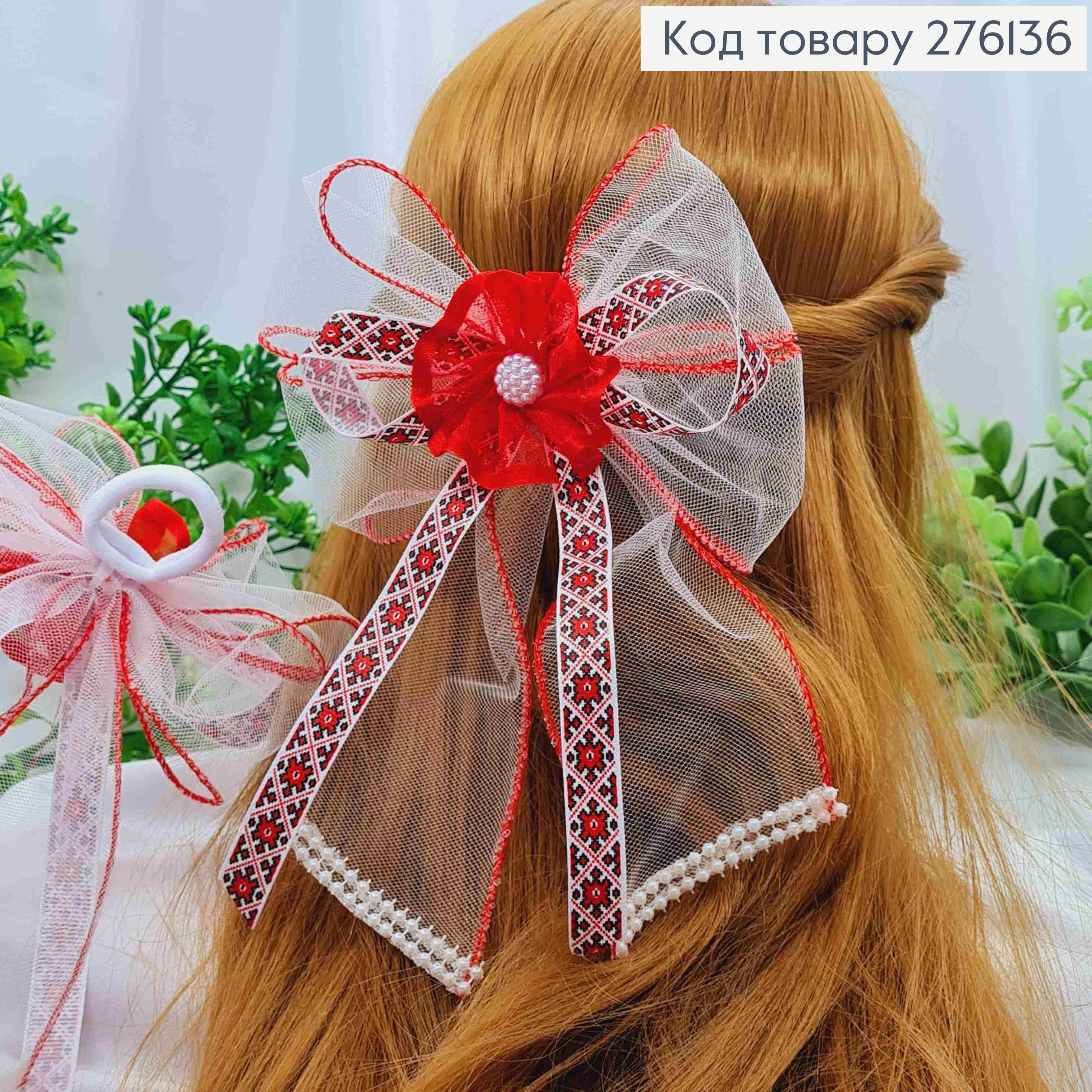 Бант БІЛИЙ з Червоним орнаментом, на резинці, тканина органза+репс, розмір 14*21см, ручна робота