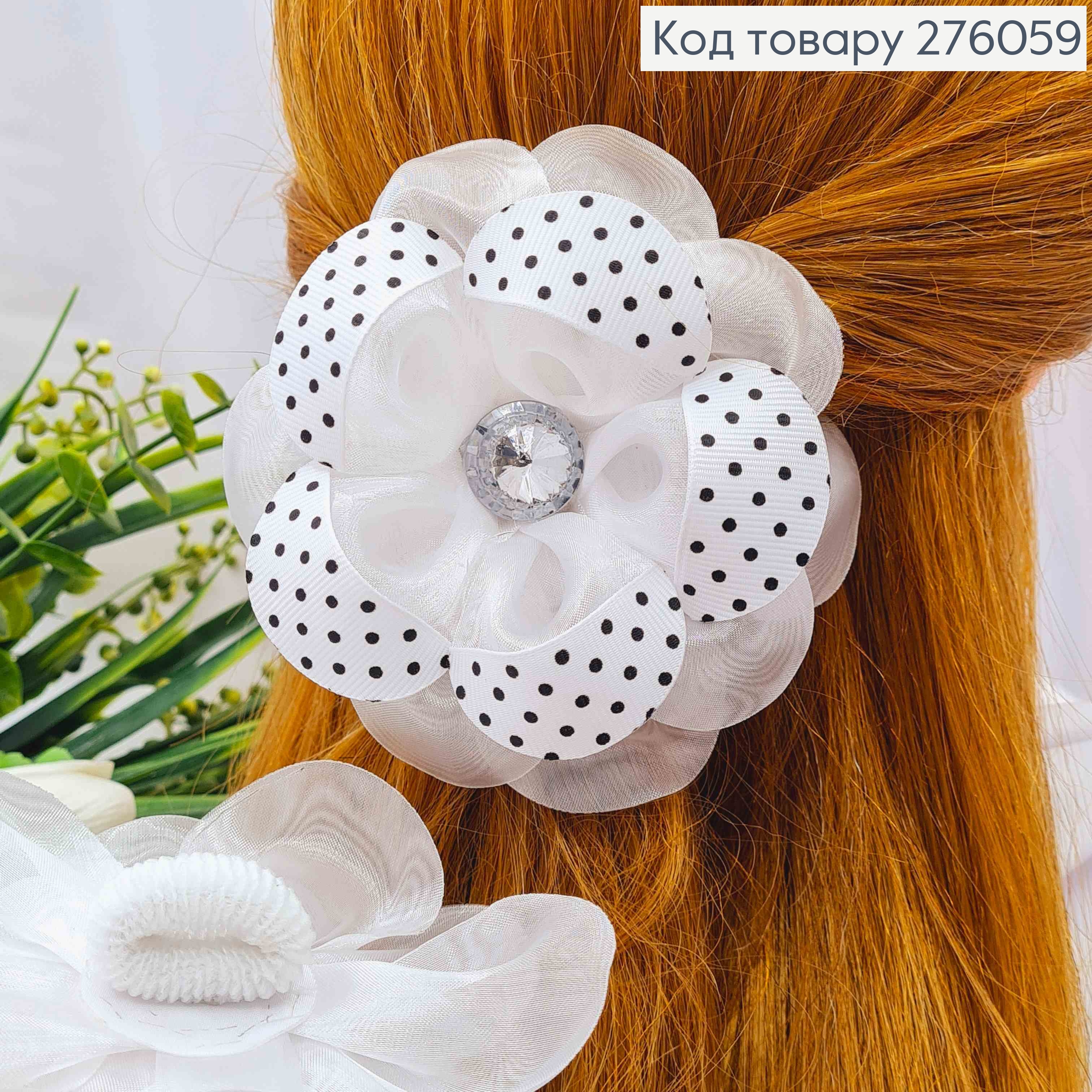 Бант БІЛИЙ з Каменем в Горошок, на резинці, тканина органза+репс, розмір 11см