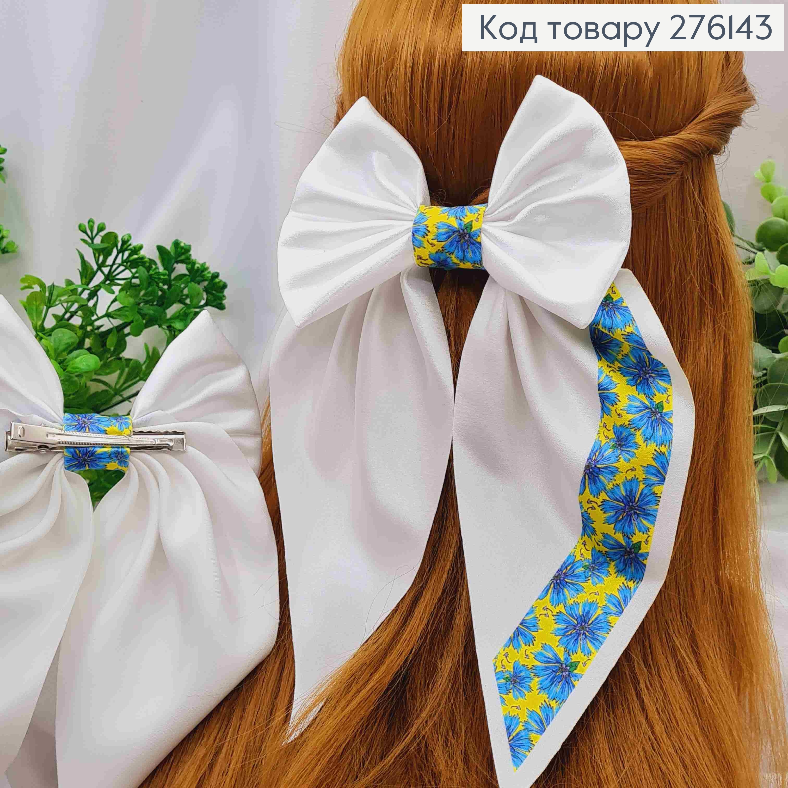 Бант БІЛИЙ з принтом "Волошки", на заколці 6,5см, тканина цупкийатлас, розм. 13*23см, ручна робота