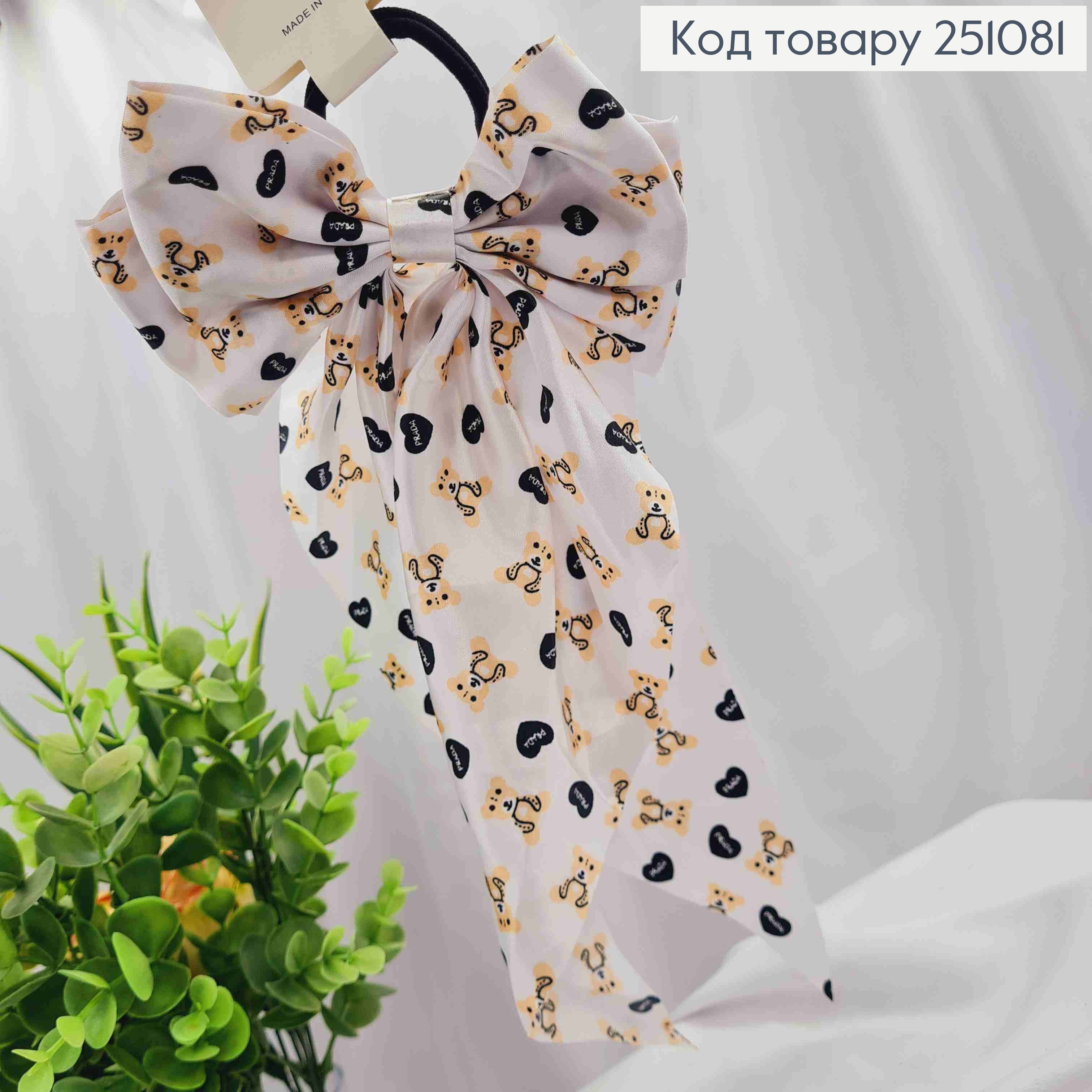 Бант БІЛОГО кольору з принтом Ведмедики, на резинці 4см, тканина атлас, розмір 15*30см