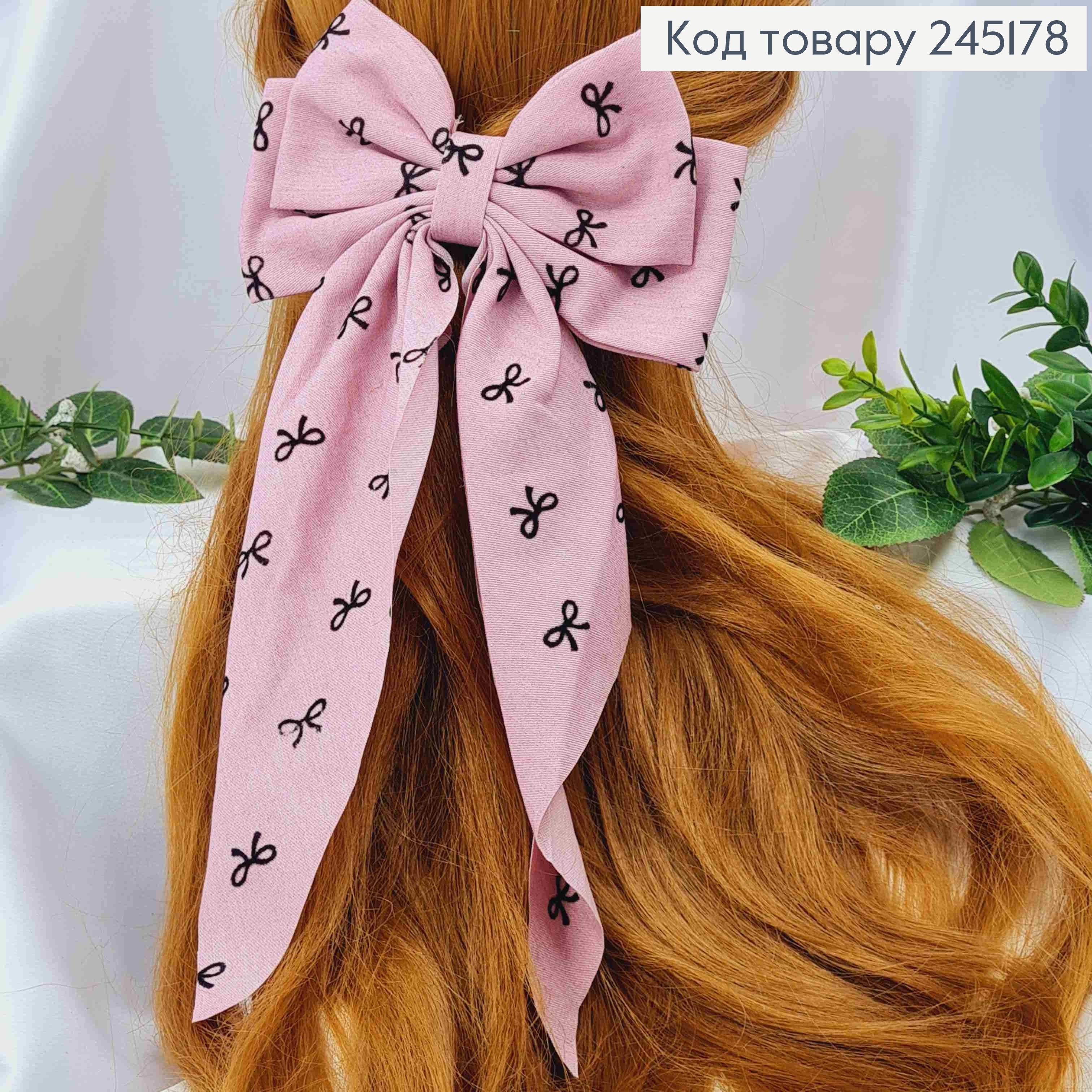 Бант РОЖЕВОГО кольору, з принтом "Бантики", на заколці автоматик, тканина Креп, розмір 14,5*30см
