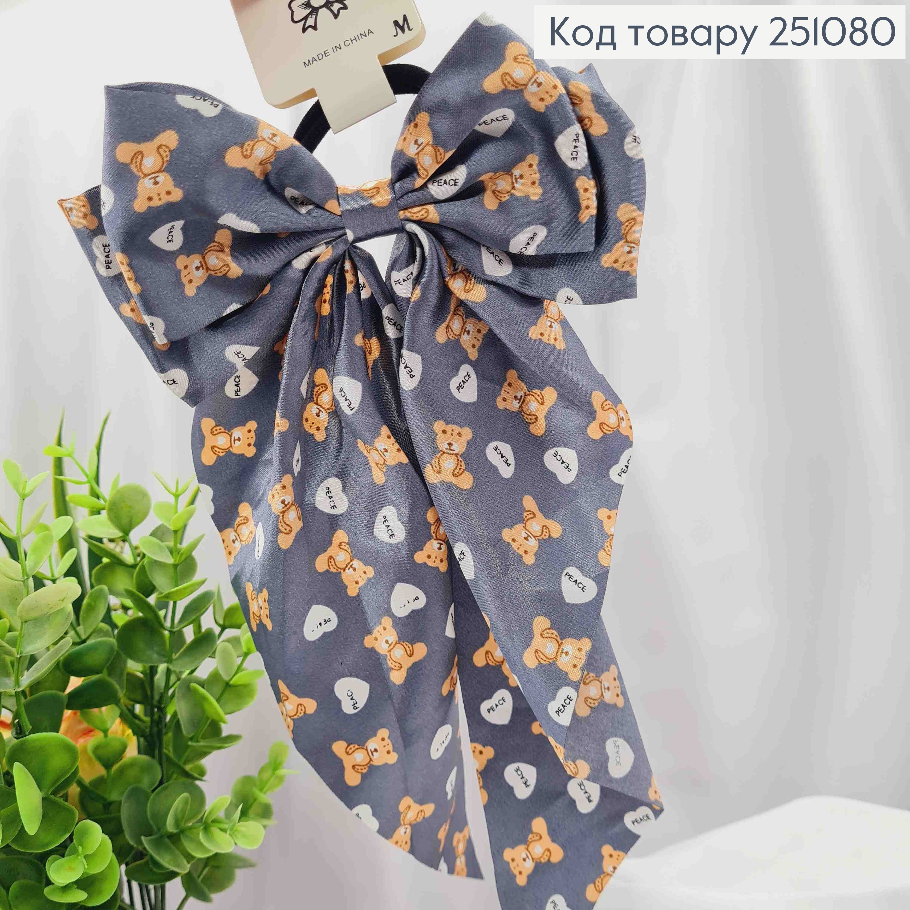 Бант СІРОГО кольору з принтом Ведмедики, на резинці 4см, тканина атлас, розмір 15*30см