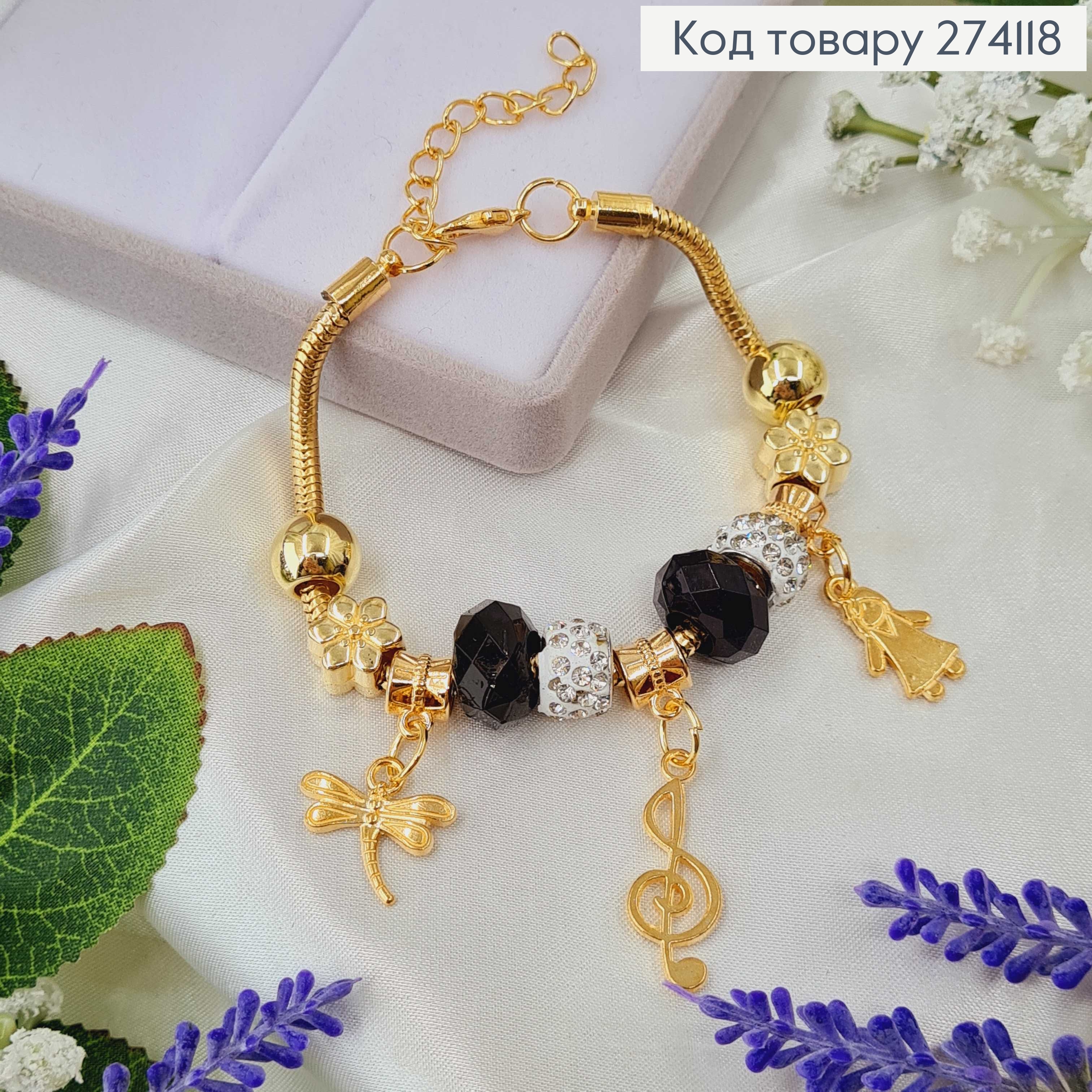 Браслет під Пандору, золотого кольору, з чорними бусинами, 15,5см+4см