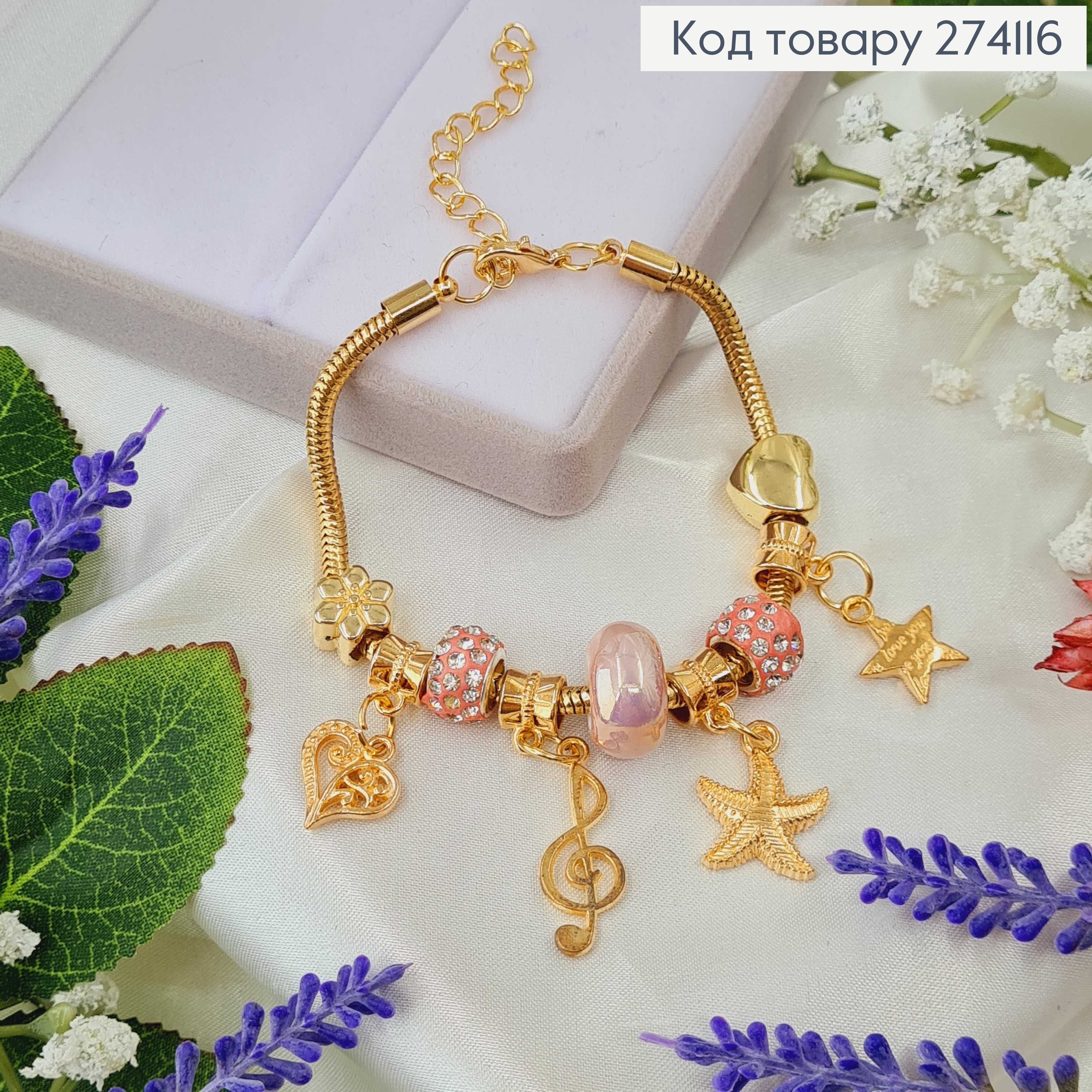 Браслет під Пандору золотого кольору, з рожевими бусинами 15,5см+4см