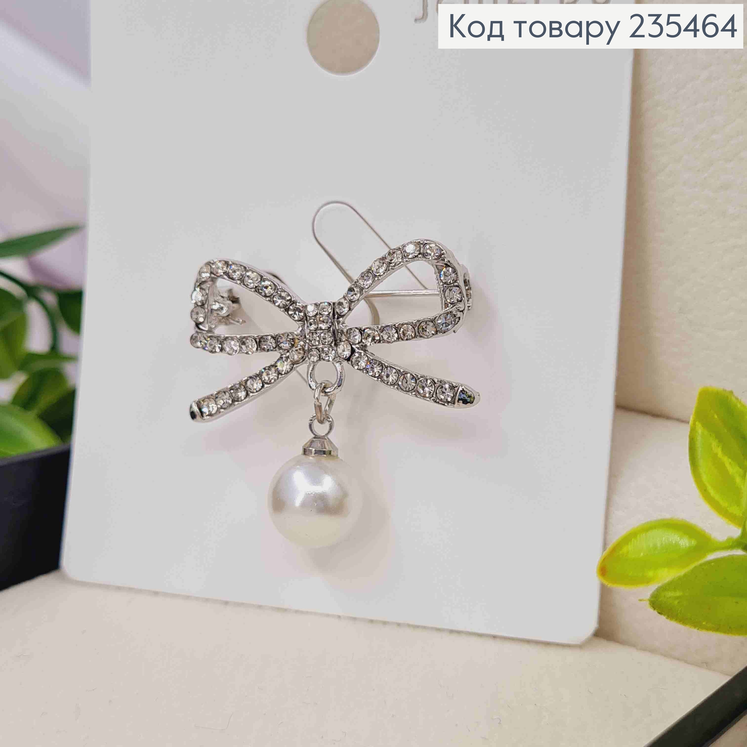Брошка "БАНТИК" з Блискучим камінням та Перликою, 3*2см, Срібного кольору