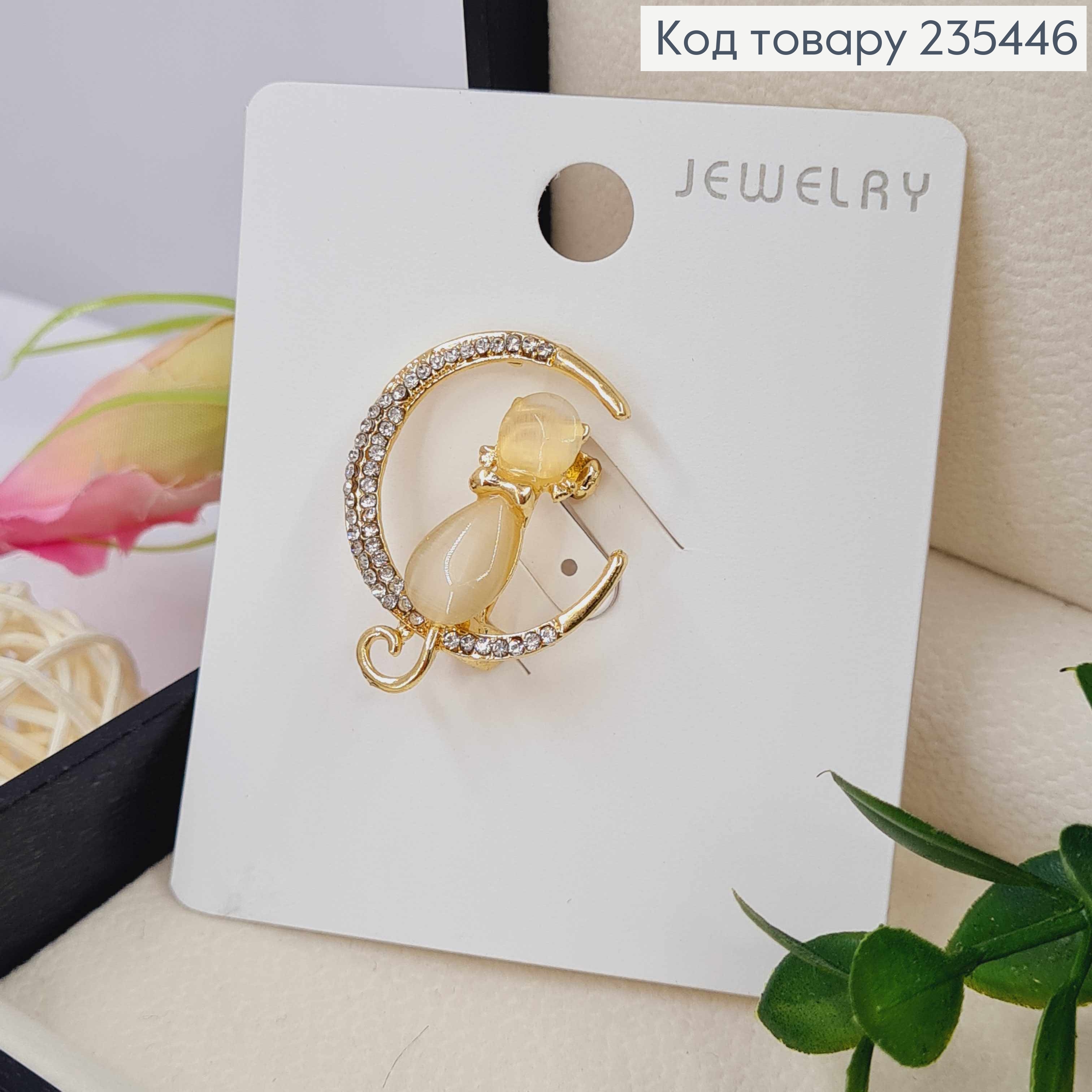 Брошка КИЦЬКА на МІСЯЦІ прикрашена Блискучими камінцями, 3,3см, Золотого кольору