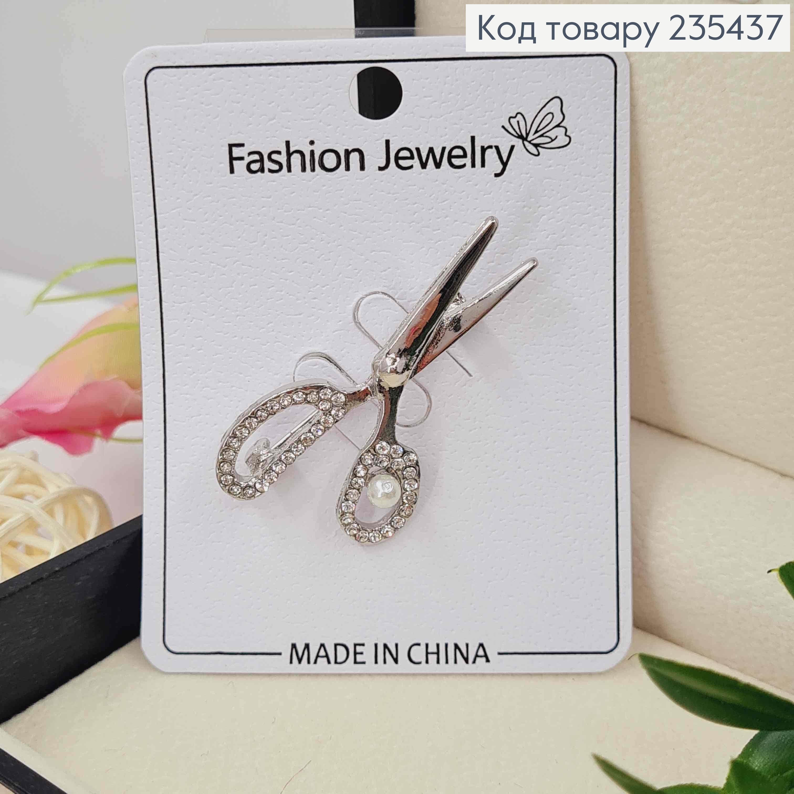 Брошка НОЖИЦІ прикрашені камінцями та бусинкою, 4,5см, Срібного кольору