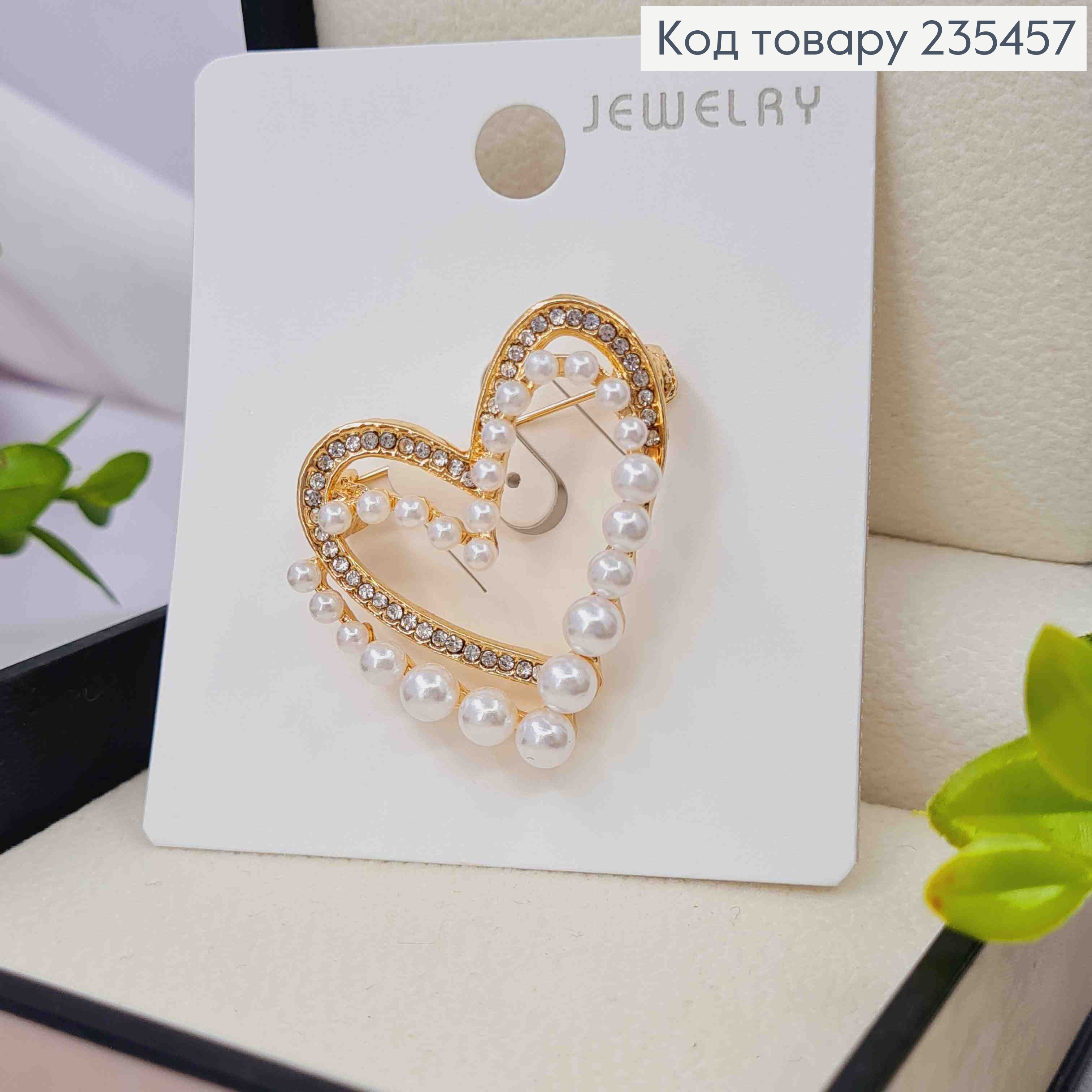 Брошка "СЕРЦЕ" з Блискучими камінцями та Перлинками, 3,5*4см, Золотого кольору
