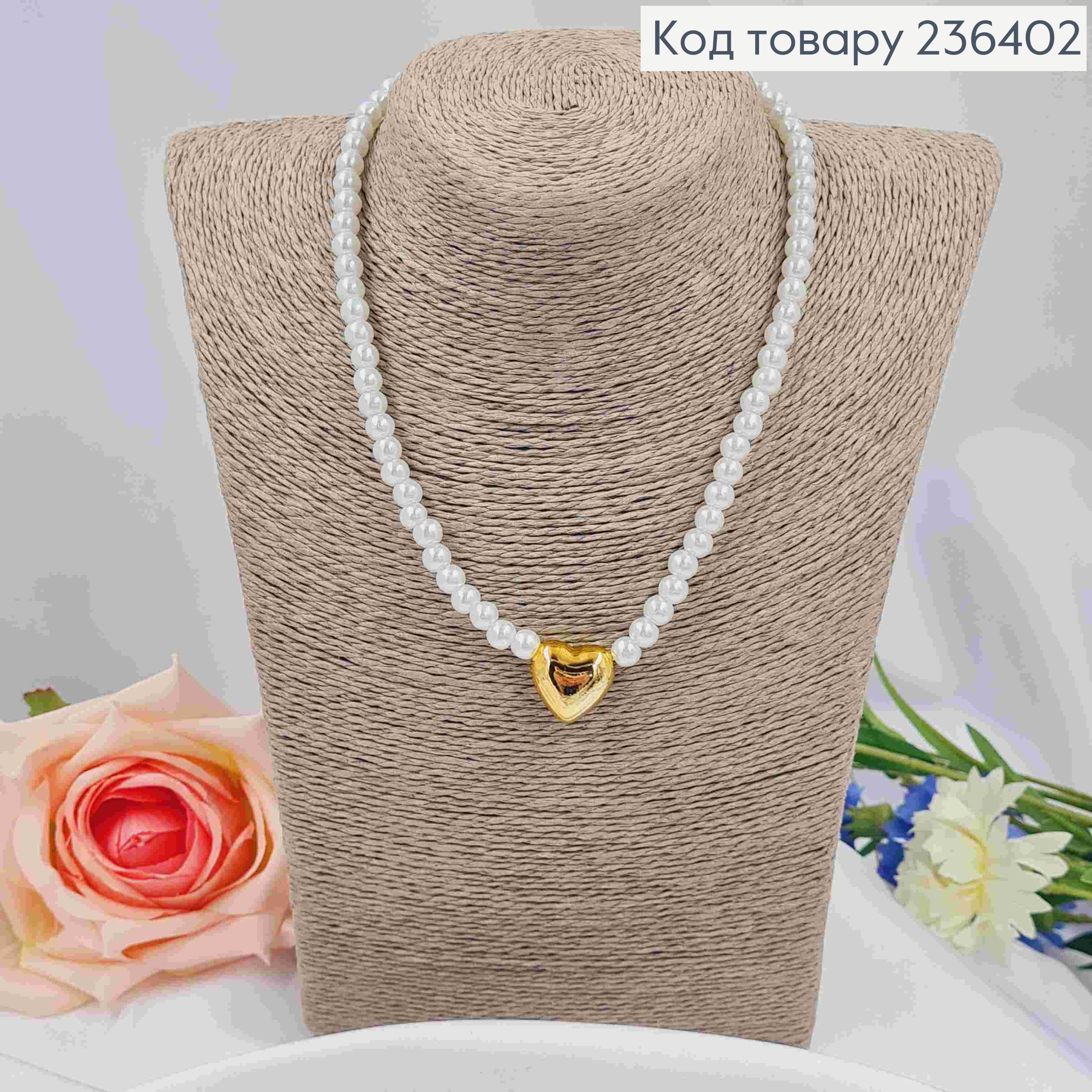 Буси з перлинок Перламутрового кольору (6мм) з підвіскою Серце золотого кольору (2см), довж. 40+4см