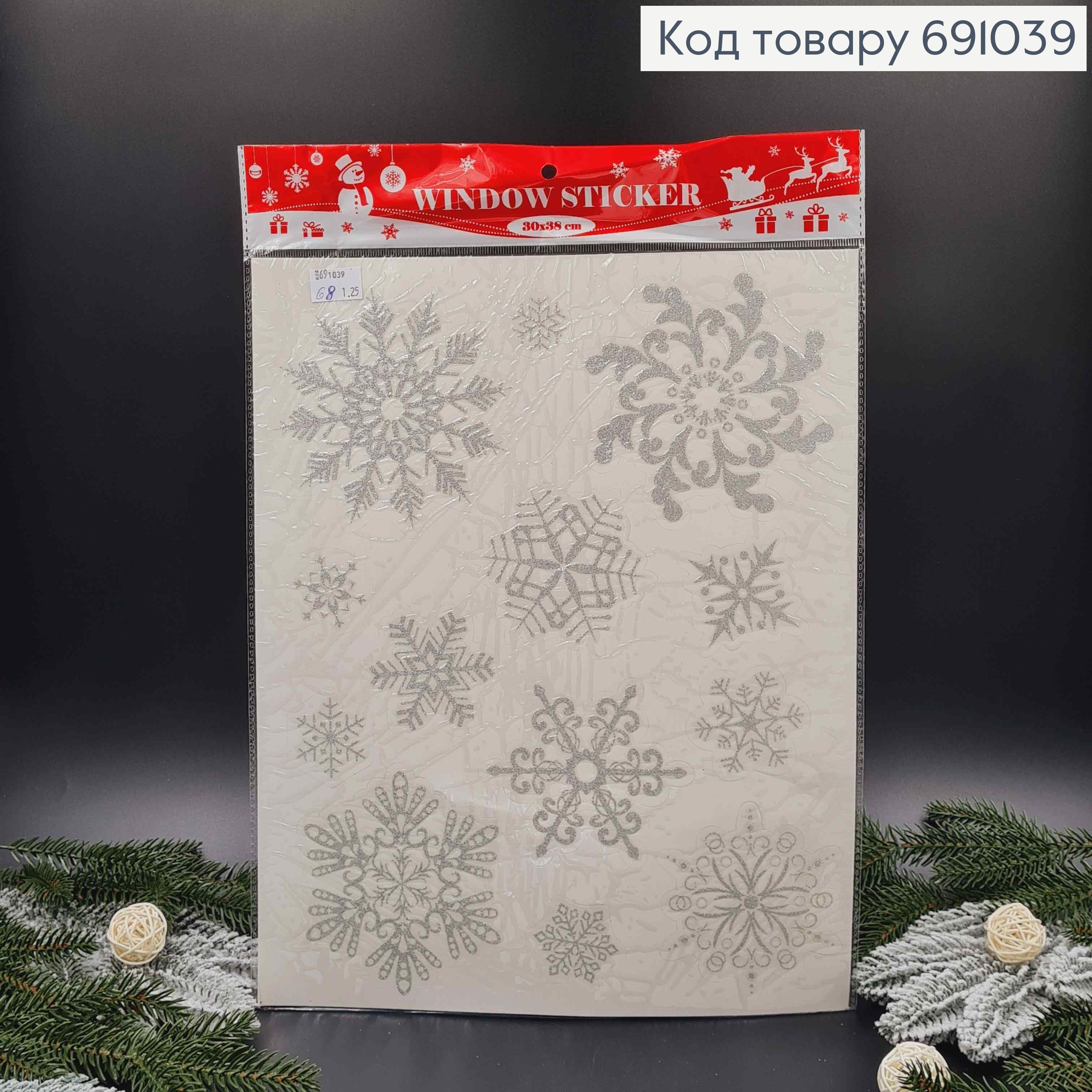 Декоративна Новорічна наліпка на скло, Сніжинки блиск, срібного кольору 30*38см