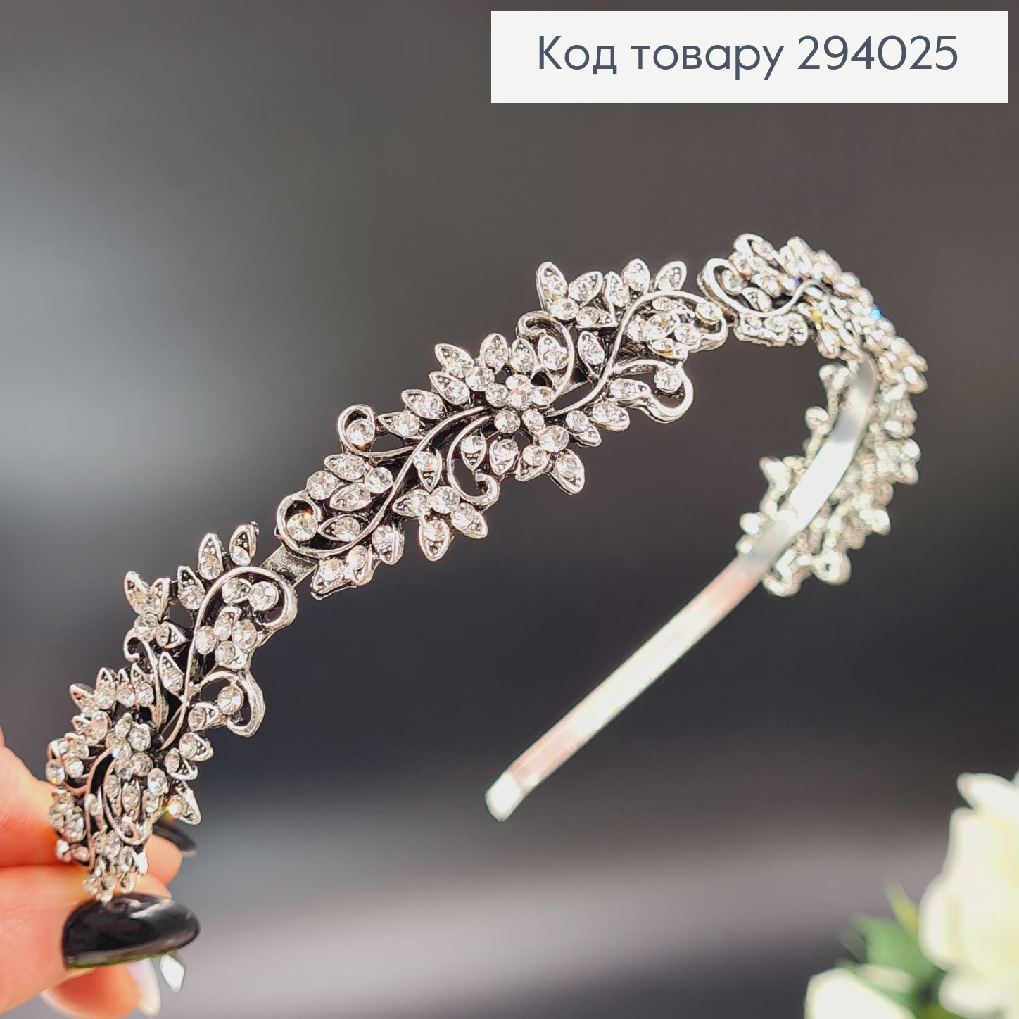 Гілочка Срібна, з ПРОЗОРИМИ камінцями різного розміру, на метал стержні, довжина 15см