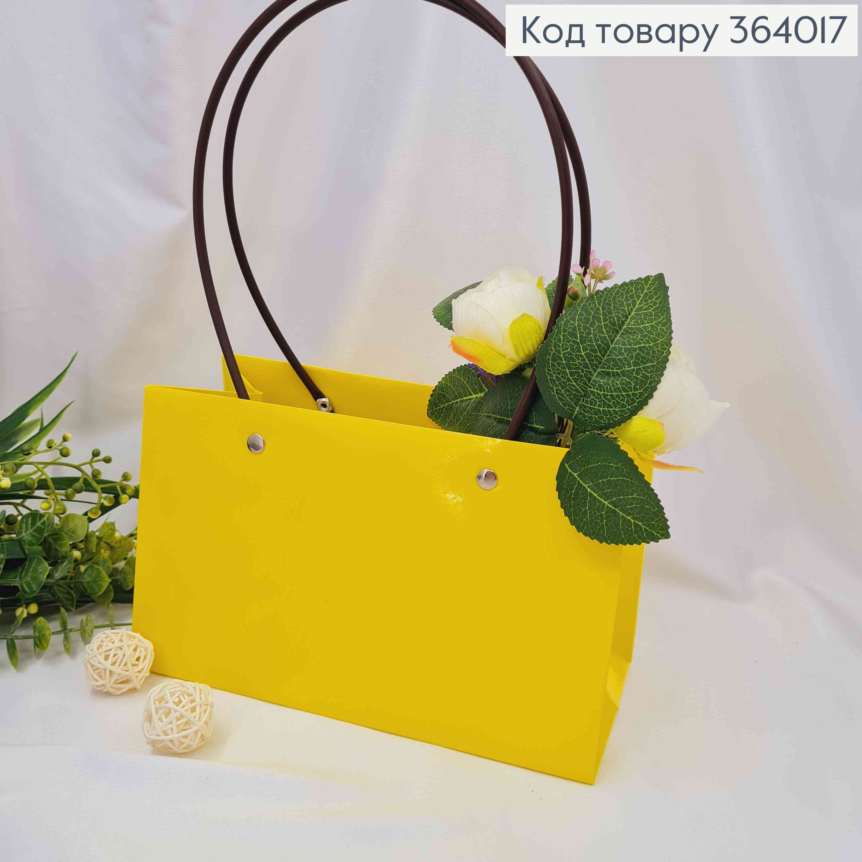 Флористическая сумочка глянцевая ЖЕЛТАЯ для цветов и подарков, с пластиковыми ручками 22*11*13,5см