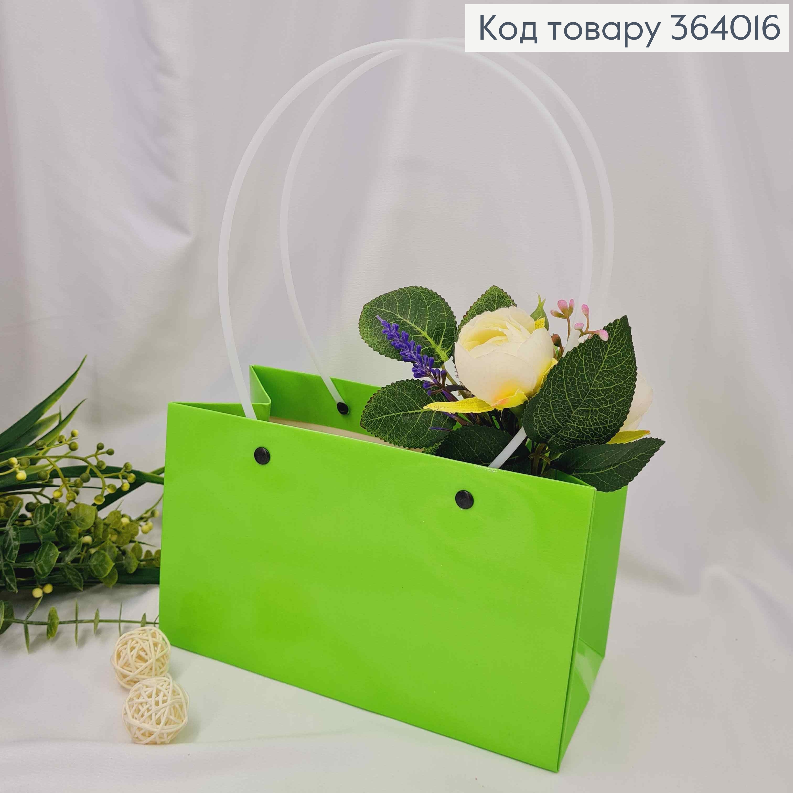 Флористична сумочка глянцева САЛАТОВА для квітів та подарунків, з пластиковими ручками 22*11*13,5см